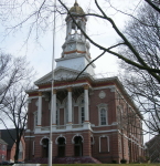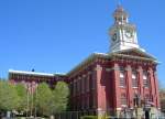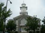 one of the worst in the country's history. The Courthouse (1854). Early courthouses sat in the town square. The original form of the present Neoclassic courthouse, built in 1854 two blocks east of the square, can be seen in this circa 1875 view before enlargement. Williams calls this style Roman Revival, possibly because of the monumental size and use of a dome rather than bell tower, as on smaller Classical Revival style courthouses. In 1898 the transverse section at the back was added with a portico matching the front; and in 1920 the ground floor at the front was extended forward to the sidewalk. These additions were made in matching style with matching stone to create a harmonious larger building. Harmony was not in vogue when the new courthouse went up in 1970 with its front on Duke Street, and connected at the side to the rear of the old courthouse. This is a utilitarian building in the Modern style, however the architects did attempt some character with alternate horizontal and vertical lines, using different sized brick on the ground floor facing, and the long narrow windowing. This is not a bad building, but for a more successful attempt at modernity, see York County. |