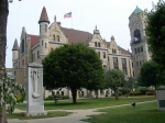 University of Pennsylvania. The Courthouse (1968). In 1968 the county opted for a new courthouse in a brick utilitarian style, with a portico to identify it as the courthouse. In front is a statue of James Stewart, the old-time movie actor, who was born in Indiana. The library next door has a (oddly interesting) Stewart Museum. The old courthouse is now a bank office building, refurbished both inside and out, and more significant architecturally. It was built around 1870 in the Second Empire style with a large tower over the front. The original jail and sheriff's residence are at the rear , reached through an enclosed upper story walkway. |