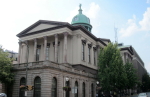 next county. The Courthouse (1864). Allentown has two courthouses across the street from each other, both in use. The original courthouse was built in 1817 and its look is preserved in this view . It was completely rebuilt in the 1860s, using much of the same stone, in an Italianate style with tower. The front is quite attractive with a Palladian window over an unusual oval doorway. Incongruous additions in both brick and stone were added to the rear early in the 20th century. The present modern eight story courthouse was dedicated in 1965, and was renovated in 2006. It is in the Modern office building style with the only decoration an attractive relief sculpture left of the entrance. |