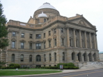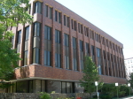 League World Series. The Courthouse (1970). The old courthouse was built in 1860 and replaced a hundred years later by this smooth brown brick one in a Modern style. This is a square building and looks the same on all four sides, although the entrance faces West Third Street. The ground floor is all glass and recessed to form a covered walkway all around. The rest is covered with a smooth glassy brick and a black window treatment that varies at the top to break the monotony. The corners are filled by right angled windows, a nice touch. The building sits back from the sidewalk and is landscaped around including, surprisingly, large trees. There is a newer county office building directly behind, also in modern office building style, but not as handsome as this courthouse. |