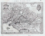 1651.4 VON VIRGINIA. 389. This title and number are at top. The cartouche title is 'VIRGINIA.' This map is one of the many versions of the John Smith map. It replaced the 1628 version (see 1628.1) of Gerard Mercator and is from the German edition of the Atlas Minor of 1651, long after Mercator's death (1512-1594). This map was first published in the 1648 edition per Burden, who also shows this 1651 copy as an example (plate 287 in Burden), see map 1648.3. The Flemish engraver and cartographer Jodocus Hondius (1563-1612), bought Mercator's plates, and published a reduced version of Mercator's folio Atlas Sive Cosmographis, and added some of his own maps. A pocket version, the Atlas Minor, was published by Cornelius Claesz and Johannes Janssonius in several editions extending past Hondius' death into the mid 1600s. Despite its small size, it is filled with towns with both English and native names, including Jamestown (Jamestowne). The area of Pennsylvania is undefined. There are no latitude markings and the longitude is apparently given from Ferro. Intaglio print. Scale: 1 inch ~ 50 miles. Size: 5.75 x 7.75 inches. |