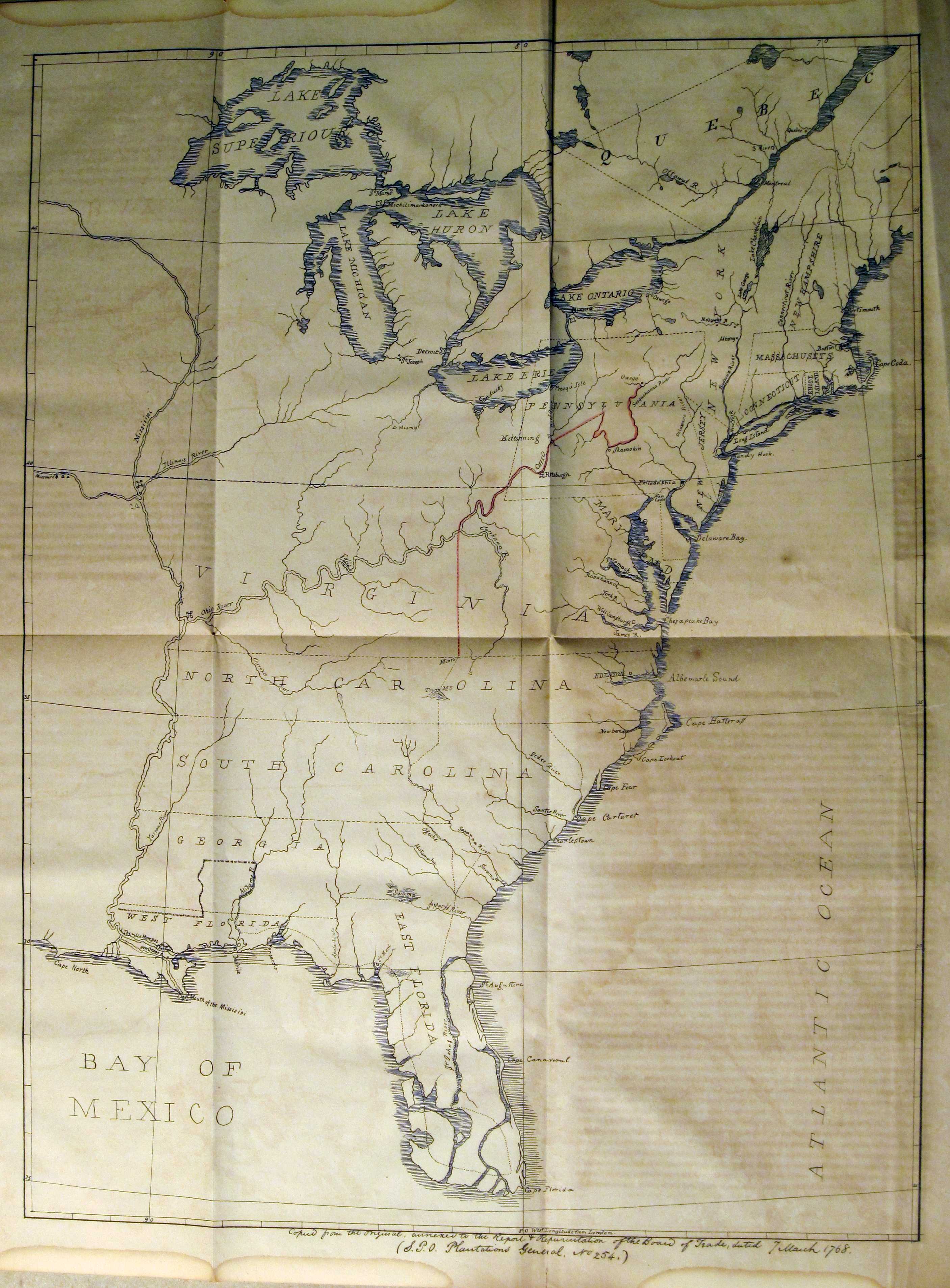 (Eastern United States) This manuscript map is reproduced in Hayes (Map 129) and is now in the British National Archives (Public Record Office). The copy shown here is a mid-19th century facsimile, probably from O'Callaghan. At bottom is "Copied from the original annexed to the report and representation of the Board of Trade, dated 7 March 1768." The map shows the eastern United States from Maine to Florida and west to the Mississippi. It appears to show the 1768 purchase line boundaries. Blank verso, longitude west from London. Scale: 1 inch = 85 miles. Size: 22 x 18.5 inches (this copy).