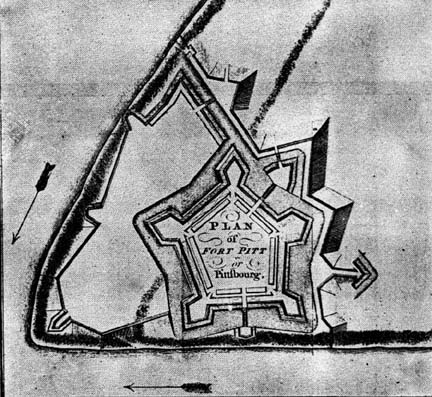 1772.1 PLAN OF FORT PITT OR PITTFBOURG, from Mante's History of the Late War, London 1772, reproduced in Winsor which is the image shown here; also reproduced in Egle. The Late War is the French and Indian War which ended circa 1763. This is the form of the fort begun in 1759 and the foundations and a surviving blockhouse can be seen today at Point State Park in Pittsburgh. Brown shows a sequence of plans dating from a manuscript sketch of Fort Duquesne in 1754 up to the 'Plan of the New Fort at Pittsburgh', November 1759, which is almost identical to this image. The history of the forts at Pittsburgh is complex. The first fort was a rudimentary one built by Virginians in 1754 and called Fort Prince George. It was destroyed the same year by the French who built Fort Duquesne. On December 1, 1758, the ruins of Fort Duquesne were officially renamed and from then on the Forks of the Ohio was called Pittsburgh. A temporary fort was built circa 1758-59 near the Monongahela River to house troops under the command of Colonel Hugh Mercer, and was called Mercer's Fort, see Brown, No. 35 and map 1758.9. This was followed by Fort Pitt, which took several years to build. It was abandoned by the British in 1772, taken over by Virginians in 1774 and renamed Fort Dunmore. It was again abandoned when the new Fort Fayette was constructed in 1791-92. This newer fort was used by General Anthony Wayne during the Indian wars in the Northwest Territory. |