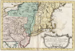 1773.1 CARTE DE LA NOUVELLE ANGLETERRE NOUVELLE YORK ET PENSILVANIE, POUR SERVIR A L' HISTAIRE DES ETABLISSEMENS EUROPEENS, par M. B. Ing, de la Mar. This map is a later edition of the 1757 map by Bellin, however the engraving is not identical. Apparently a new plate was cut using the old as a guide for a new book Atlas portatif pour servir a ... l'histoire philosophique et politique... by E. van Harrevelt, Amsterdam 1773 (McCorkle #773.1, #783.2). There were many versions of this Bellin map and the exact dating of this copy is uncertain. The boundary of Pennsylvania and New York is carried to the 43rd parallel and the Delaware separation is not shown. Delaware's separation from Pennsylvania was not shown on many colonial maps because both colonies had the same proprietor, a Penn. Longitude is west from Paris. Blank verso, the color is not original. Scale:1"=56 miles. Size: 9.5 x 14. |