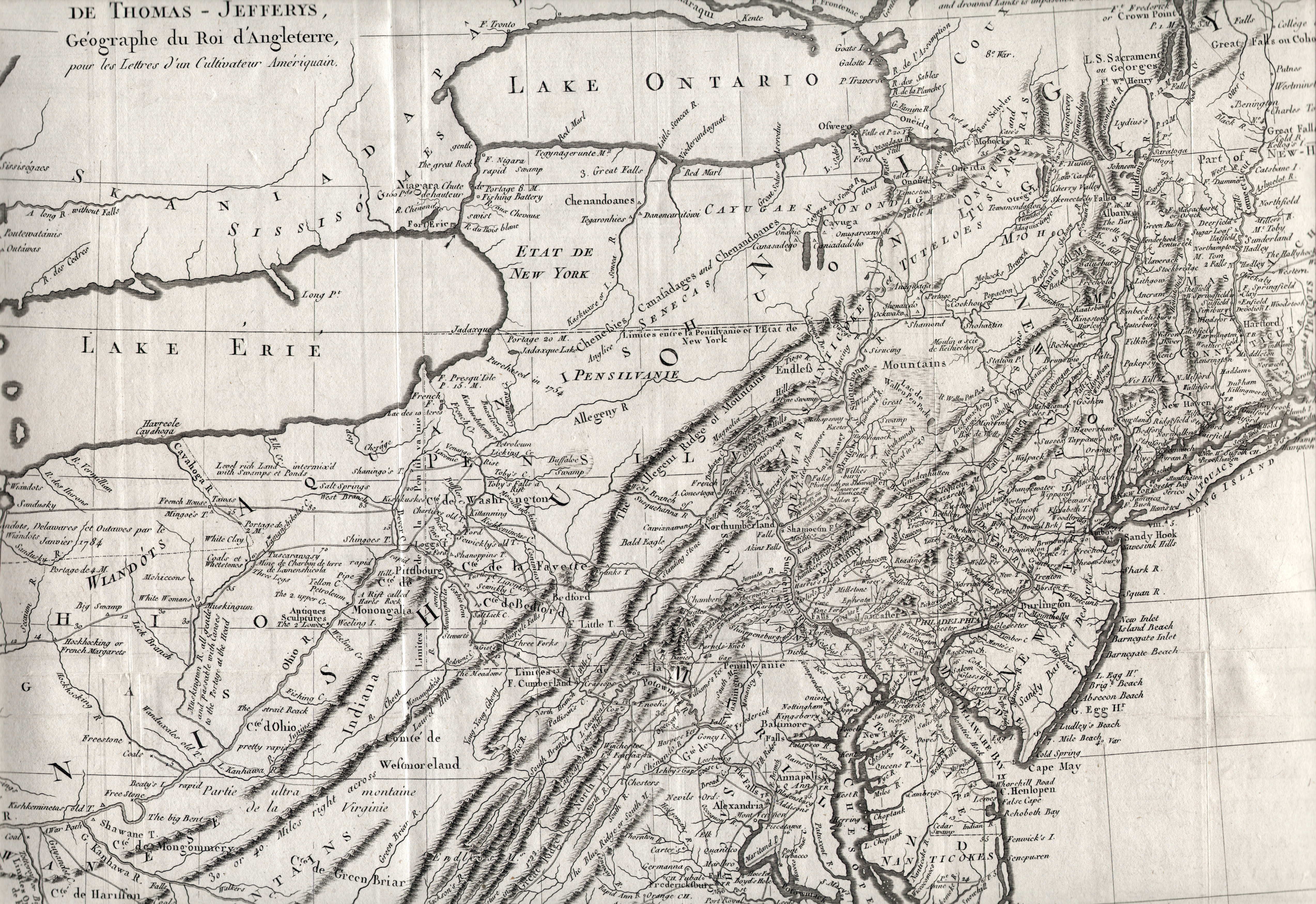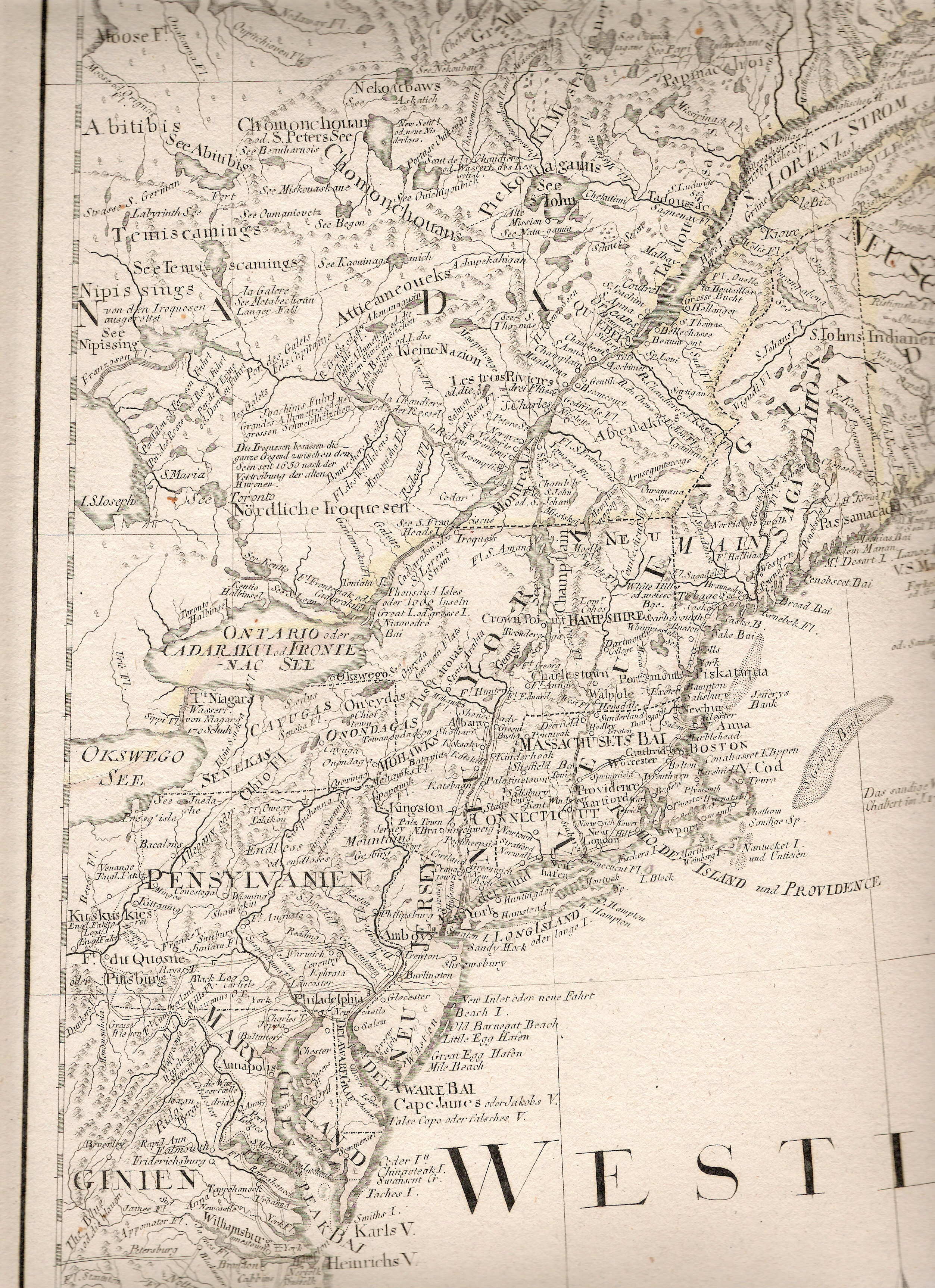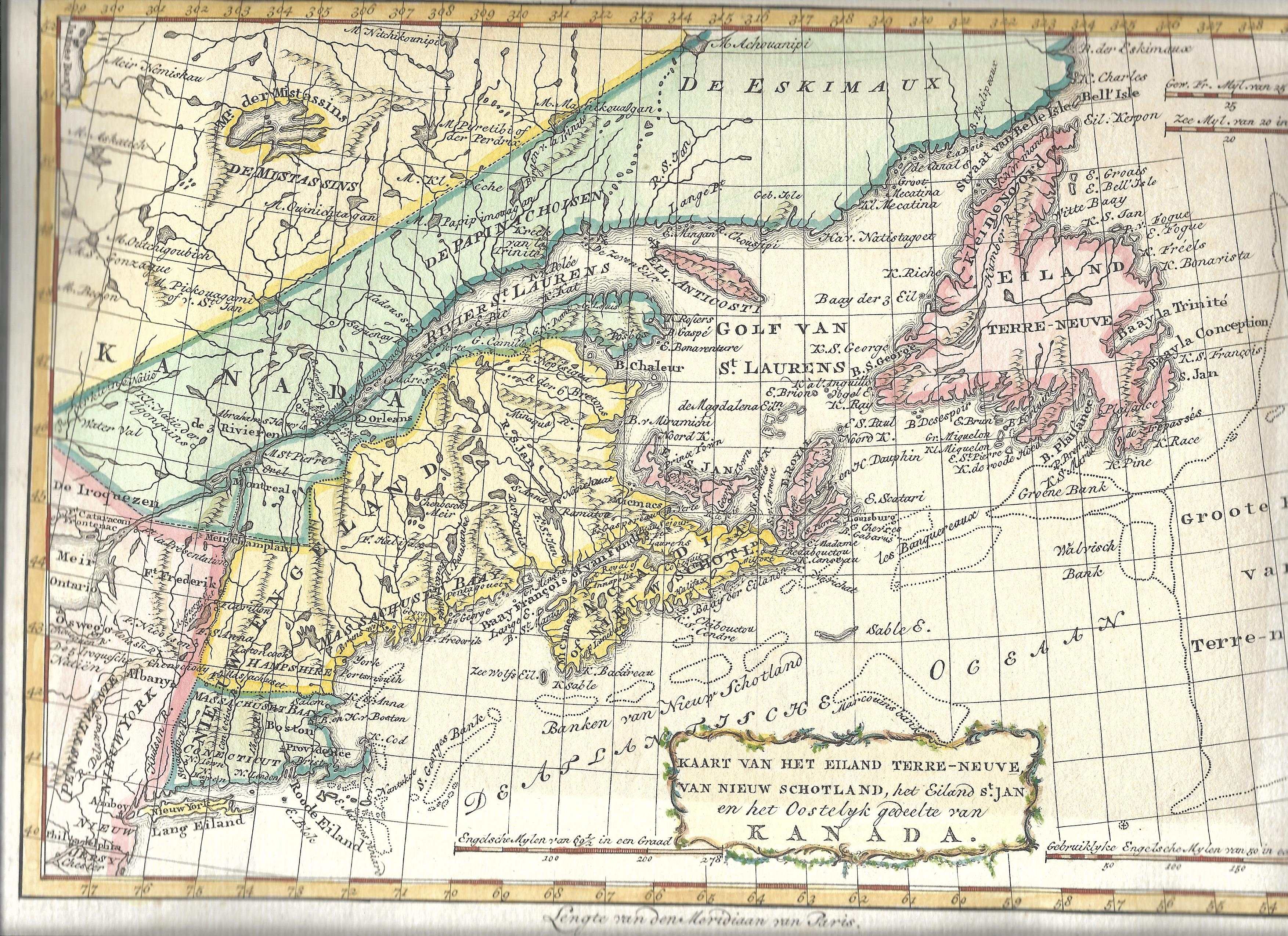 copy is likely not original. There is a companion map of the northeast and maritime provinces: KAART VAN HET EILAND TERRE-NEUVE, VAN NIEUW SCHOTLAND, HET EILAND ST. JAN EN HET OOSTELYK GEDEELTE VAN KANADA where a small slice of Pennsylvania appears in the bottom left corner.There is also companion map of