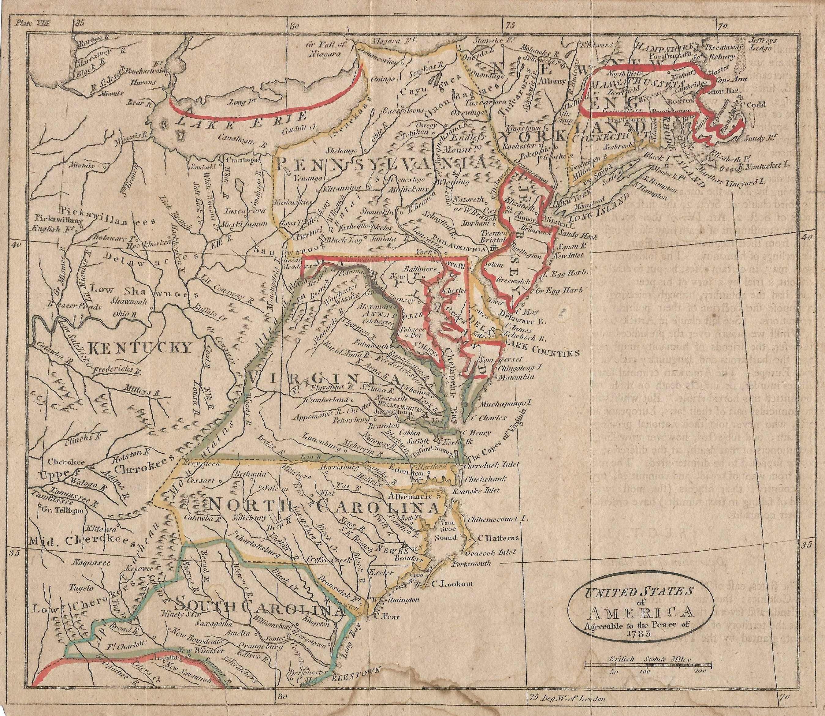 Sellers & van Ee #194; Wheat & Brun #149, 153. Blank verso, longitude west from London at top, from Philadelphia at bottom. Scale: 1 inch = 111 miles. Size: 12.5 x 15.5 inches. |