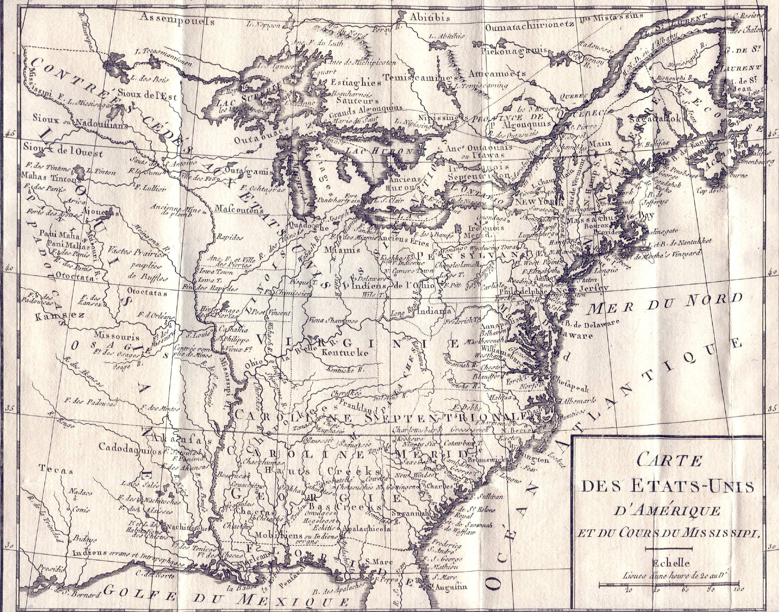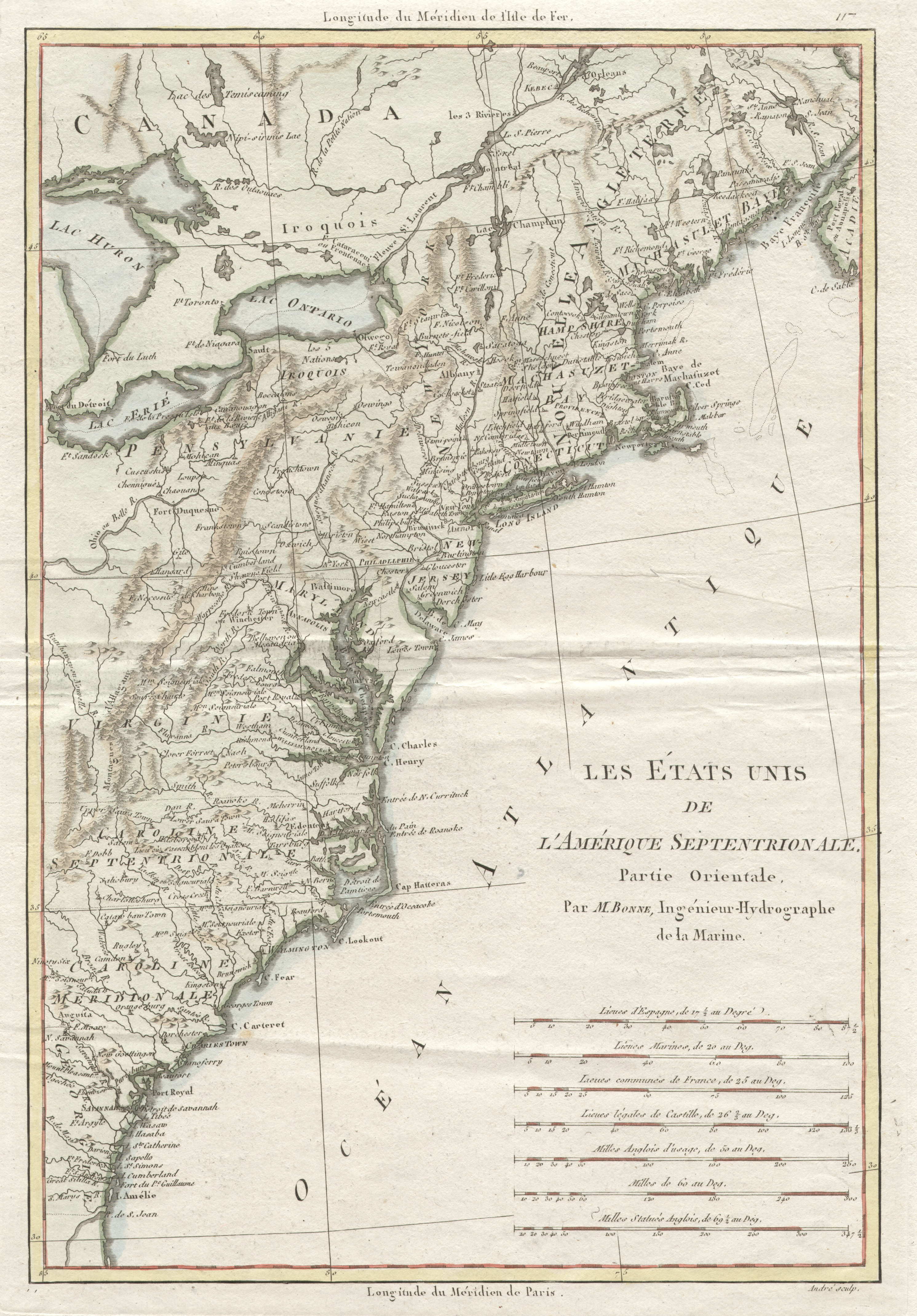 ETATS-UNIS DE L'AMERIQUE SEPTENTRIONALE Avec les Isles Royale, de Terre Neuve, de St. Jean, l'Acadie &c. 1785. Supplement a l'Atlas de M. Robert de Vaugondy a Paris chez Boudet Imprimeur du Roi. This map of the eastern United States appears in editions of the Atlas Universel. The lower right corner table details the proposed states of the new United States. Later states of this map attribute it to Delamarche in the title, rather than Boudet, and the work on this map was probably done by him. This edition, with Boudet's name is most likely the first state issued in 1785 just before Vaugondy's death. The scale at the bottom appears to be inaccurate when compared to the scale derived from measuring latitude lines. Colorful hand colored cartouche. An image can be seen at mapforum.com , Issue 1; and also at the Darlington Library. Mccorkle #785.5; Sellers & van Ee #187, 761. Intaglio print. Longitude west from Ferro, blank verso. Scale: 1 inch = 120 miles. Size: 18.5 x 24.5 inches. |