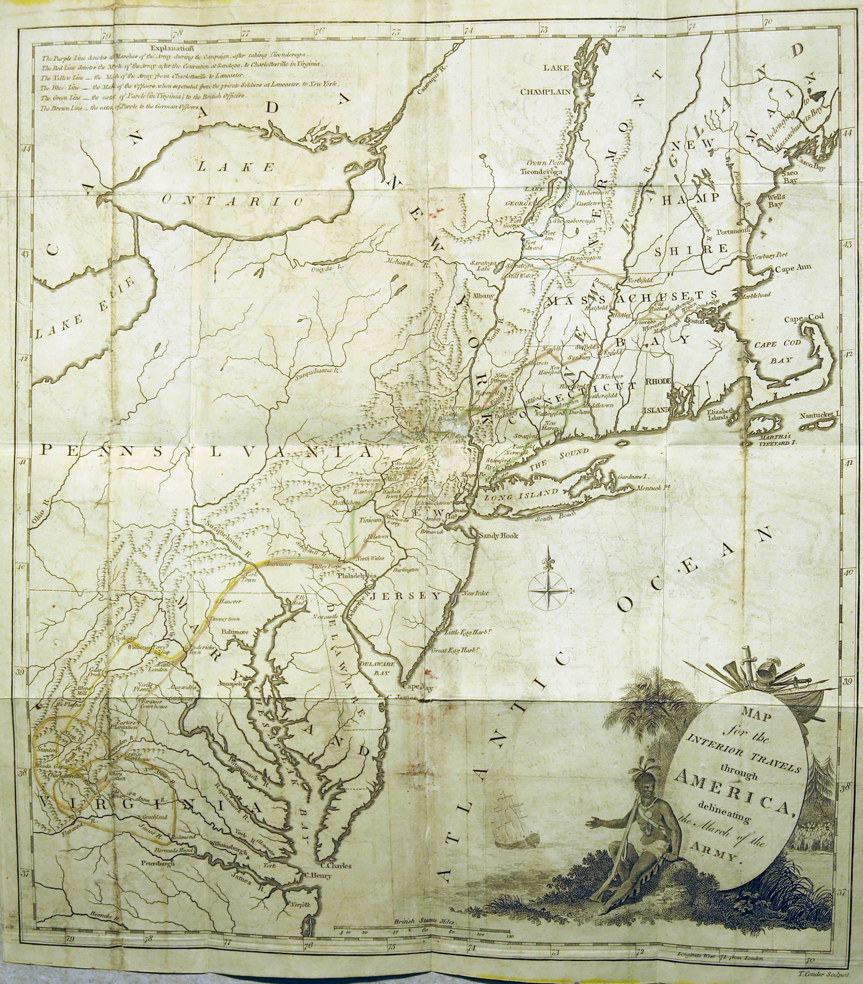 especially Valley Forge. Auburey was an officer in the British army of General John Burgoyne, and his account is one of better ones. The map is color coded to illustrate the marches as described at top left. The four marches shown on this copy are: Fort Ticonderoga to Saratoga; Saratoga to Charlottesville; Charlottesville to Lancaster; and Lancaster to New York. Although six routes are indicated in the legend, only four (brown, green, yellow, blue) are marked on this copy. This is an unusual map in that the printed legend of the marches requires a hand addition. McCorkle #789.5. Size: 15.75 x 14 inches. Scale: 1 inch = 39 miles. |