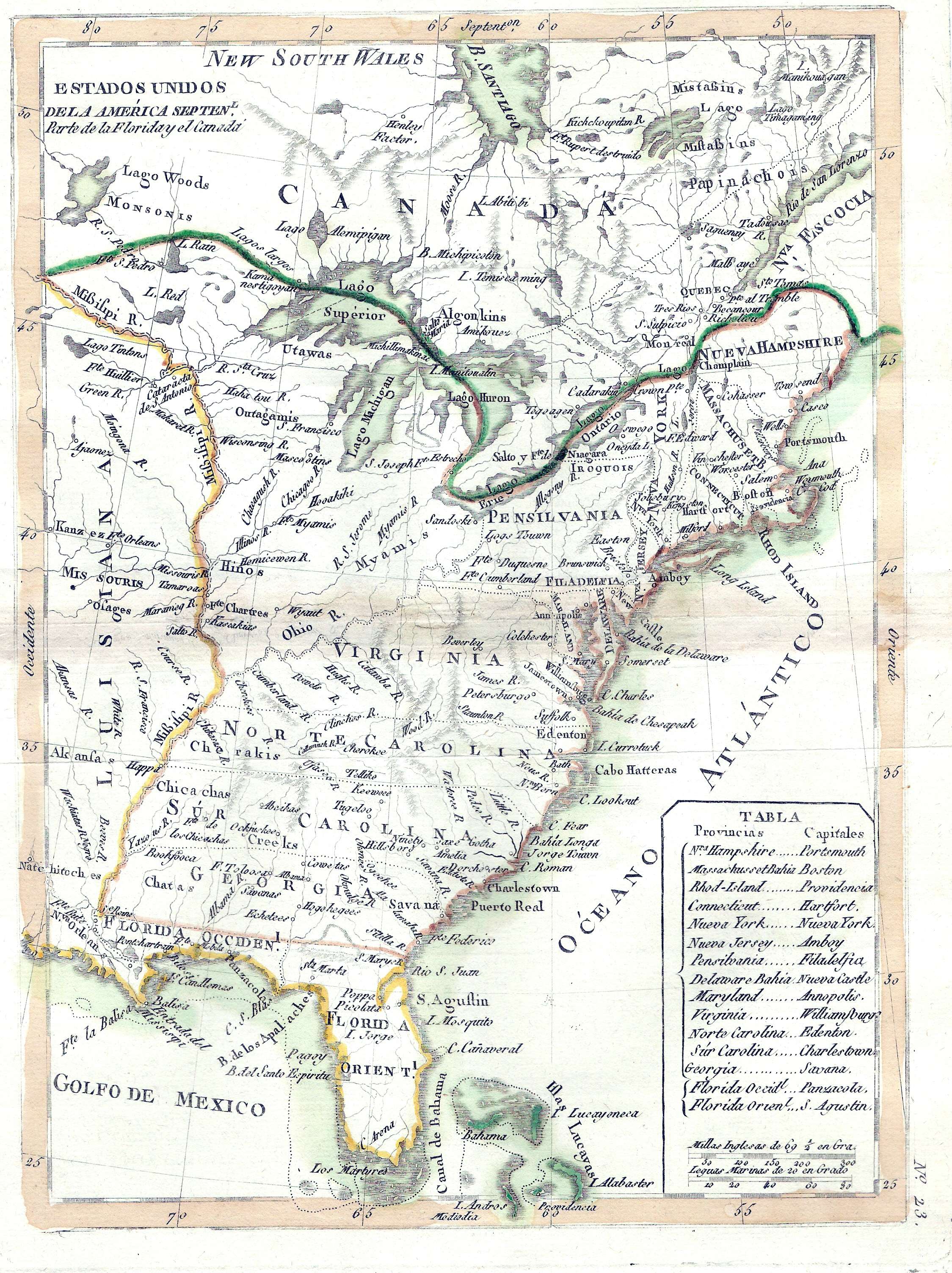 Blank verso; longitude from Philadelphia at top, from London at bottom. Scale: 1 inch = 34 miles. Size: 19 x 26 inches.