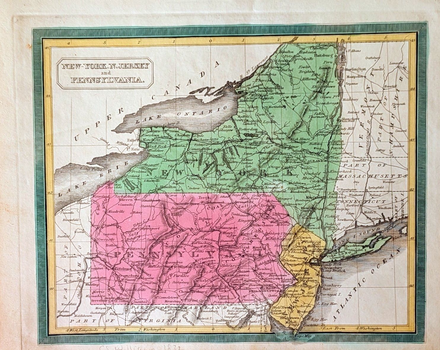 MAP OF PENNSYLVANIA NEW JERSEY AND DELAWARE CONSTRUCTED FROM THE LATEST AUTHORITIES, Published by S. Augustus Mitchell 1831. Engraved by J.H. Young. This is the first edition of Mitchell's map of Pennsylvania that was included in his American Atlas. Mitchell purchased the plates from Anthony Finley and subsequently published them under his name. The map is delineated by county in color with canals, proposed canals, railroads, proposed railroads, and roads depicted in outline; and is surrounded by a keyboard-style border.. A table at lower left shows population for 1810 and 1820 for Pennsylvania, New Jersey and Delaware. This map is the same as the undated circa 1830 pocket map shown in the article Pennsylvania in Early Pocket Maps and likely printed from the same plate, but printed on standard paper, not onionskin. It is not clear which map would have been printed first and the pocket map may date to 1831 also. Blank verso, longitude from Washington at bottom, from Greenwich at top. Intaglio print. Scale: 1 inch = 18 miles. Size: 17 x 21.5 inches. |