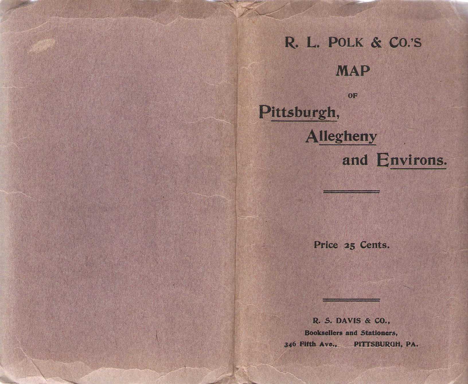 1900 R. L. POLK & CO'S MAP OF PITTSBURGH, ALLEGHENY AND ENVIRONS. R. S. Davis & Co., Booksellers and Stationers, 346 Fifth Ave., Pittsburgh, Pa. This title is on the 7 x 4 inch brown paper cover, which is blank inside. The map title is 'Map of the Cities of Pittsburgh Allegheny and Environs.' 1900. R. L. Polk & Co. Publishers. Copyright 1900. There is a street gazetteer on the verso (not shown here) matching the grid around the map. One and two mile circles are drawn which center on the old City Hall on Smithfield Street. Pittsburgh incorporated Allegheny City around 1907. This map is printed on waxy paper to resist tearing and this copy is in good shape. Text on verso, no longitude. Scale: 1 inch = 0.25 miles. Size: 28.5 x 40 inches. |