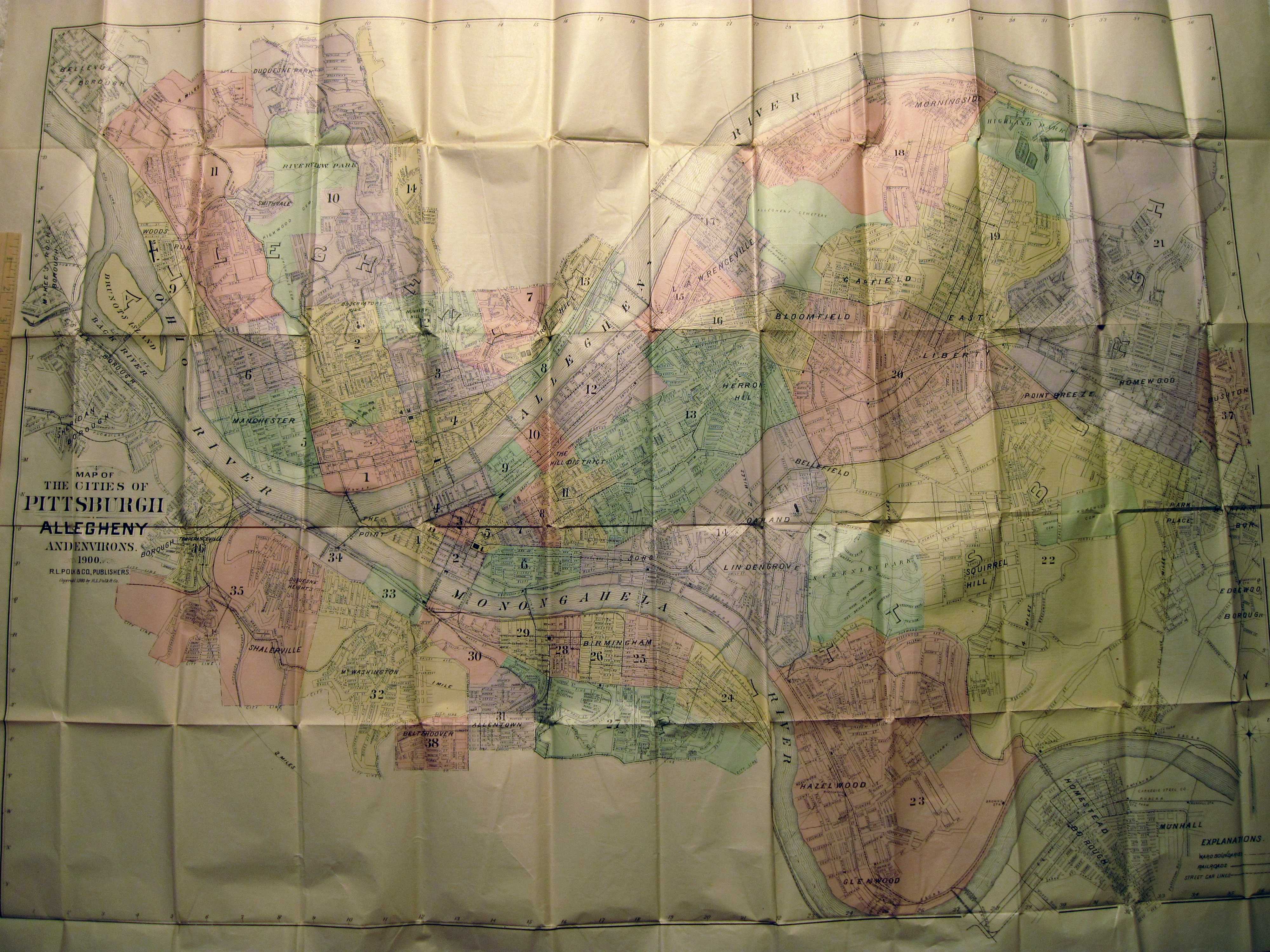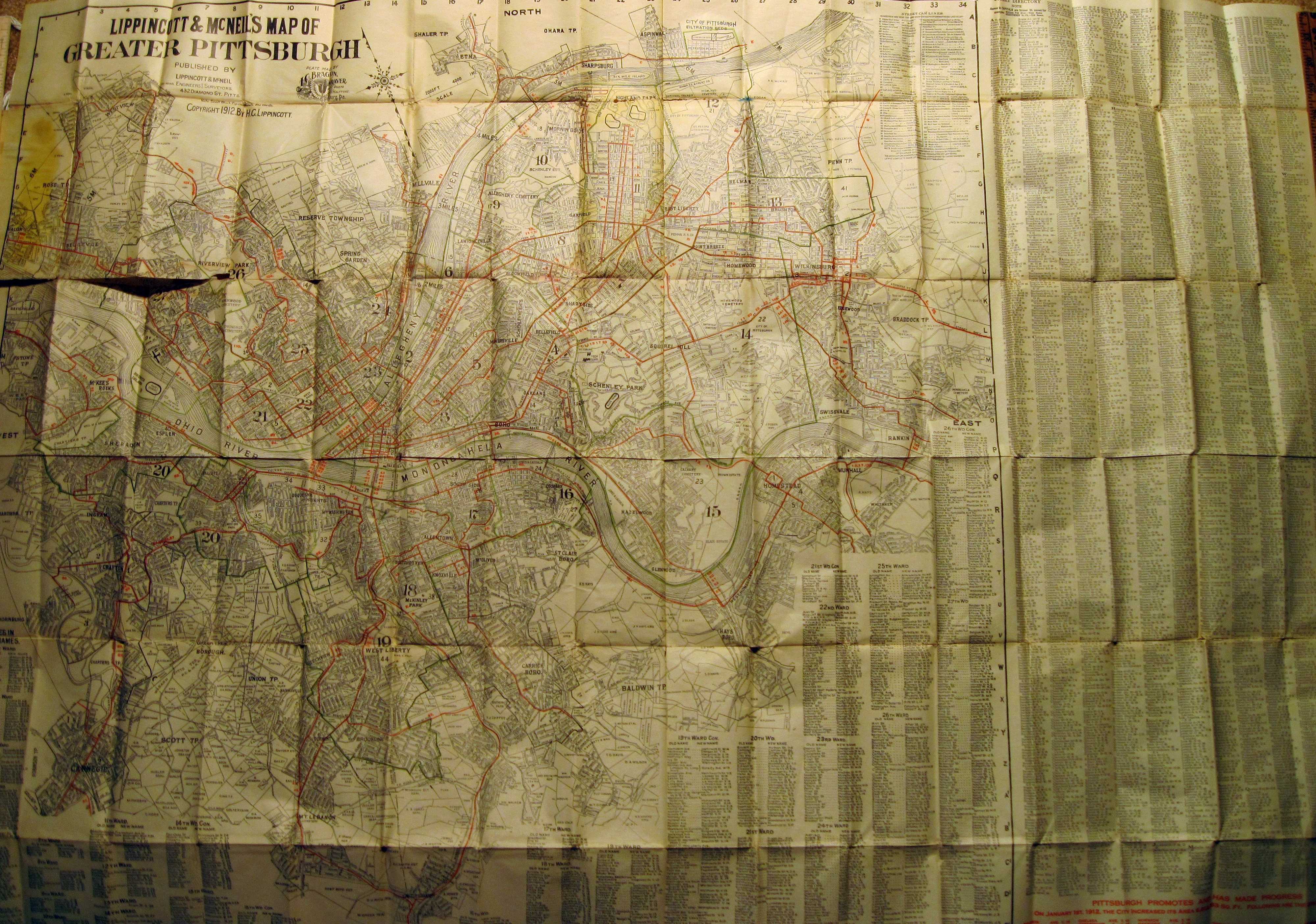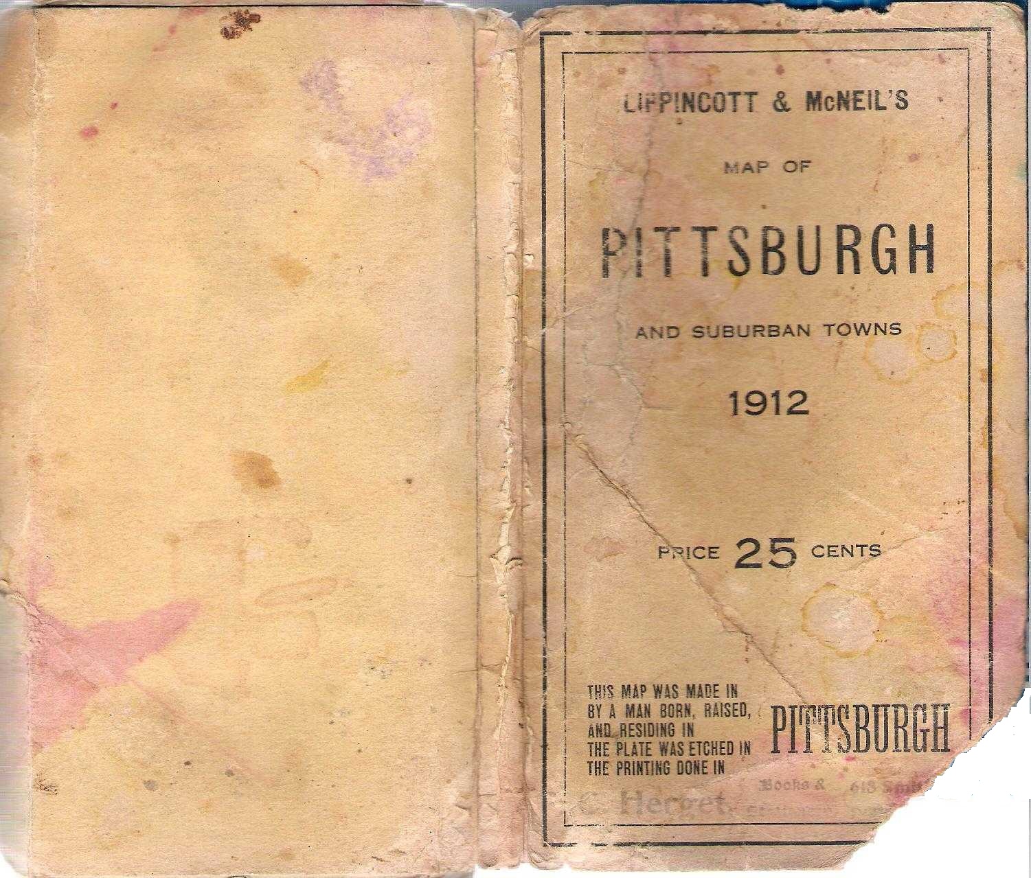 1912 LIPPINCOTT AND MCNEIL'S MAP OF GREATER PITTSBURGH. Published by Lippincott and McNeil, Engineers and Surveyors, 432 Diamond St., Pitts. Copyright 1912 by H. C. Lippincott. Plate made by I. C. Bragdon, Engraver, wood, photo, and halftone. This is a street map of Pittsburgh, and shows the immediate city and close-in suburbs. Street car lines are in red, and a street index is at right. Apparently a renaming of streets occurred around this time as a listing of old and new street names is given at the bottom. It folds into a 6 x 4 inch yellow paper cover with a similar title which is blank inside. The note on the cover states with great insistence that it was made in Pittsburgh. There were later versions of this map, though this may be the earliest one. The map is printed on ordinary paper and this copy has one long crease tear, but is otherwise in decent shape. Blank verso, no longitude. No scale, but 1 inch ~ 5 blocks. Size: 32 x 46 inches, map only: 32 x 34 inches. |