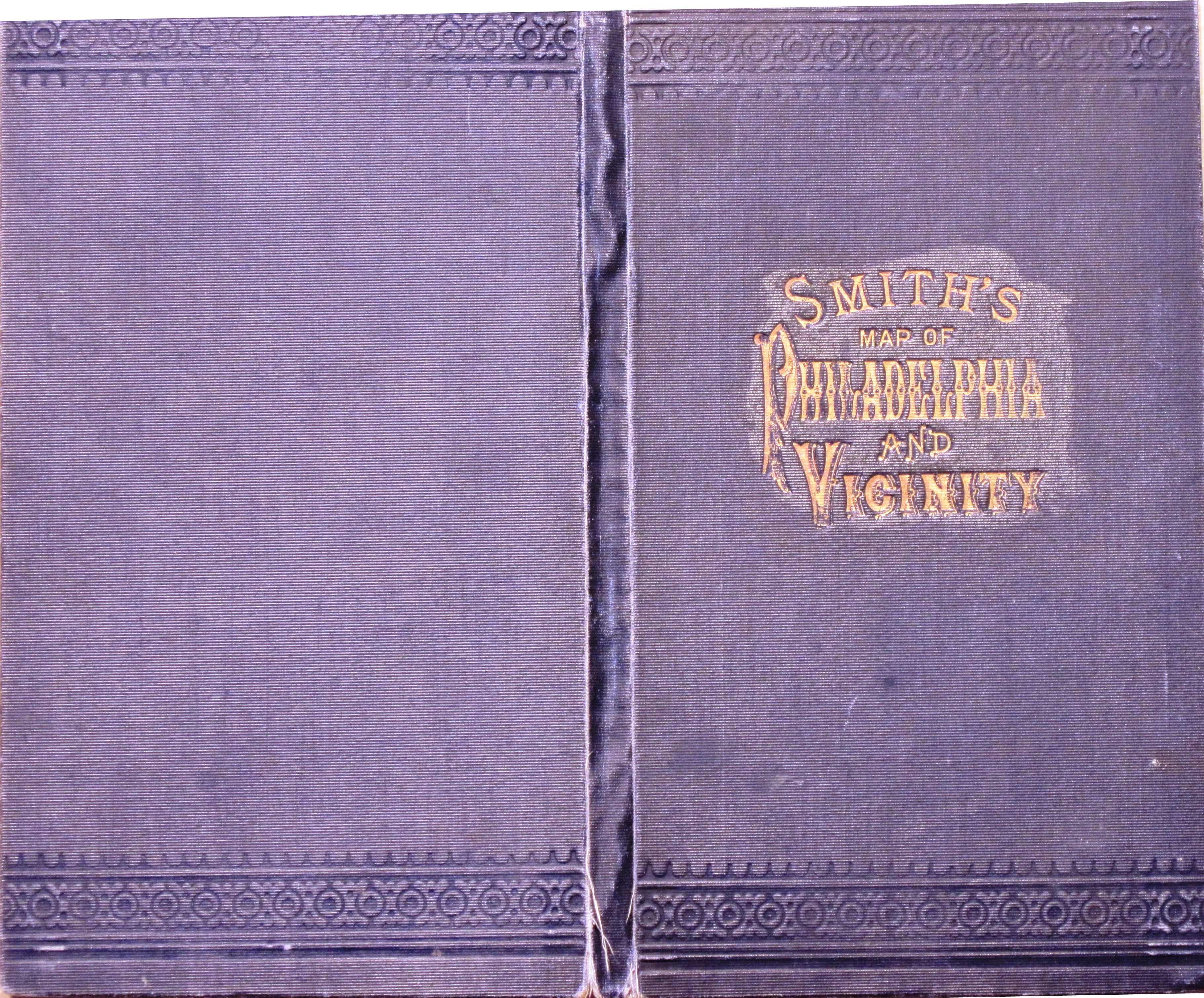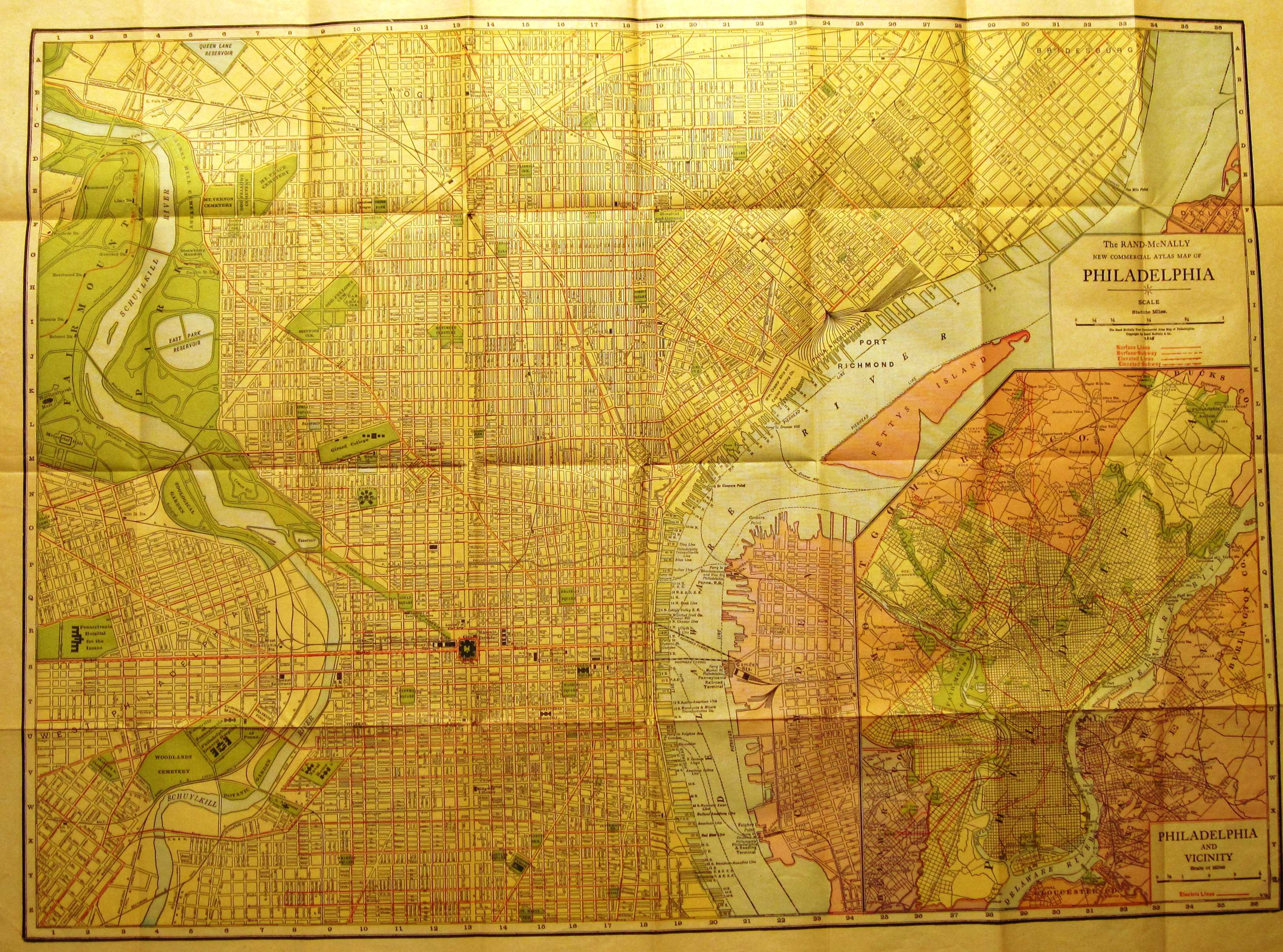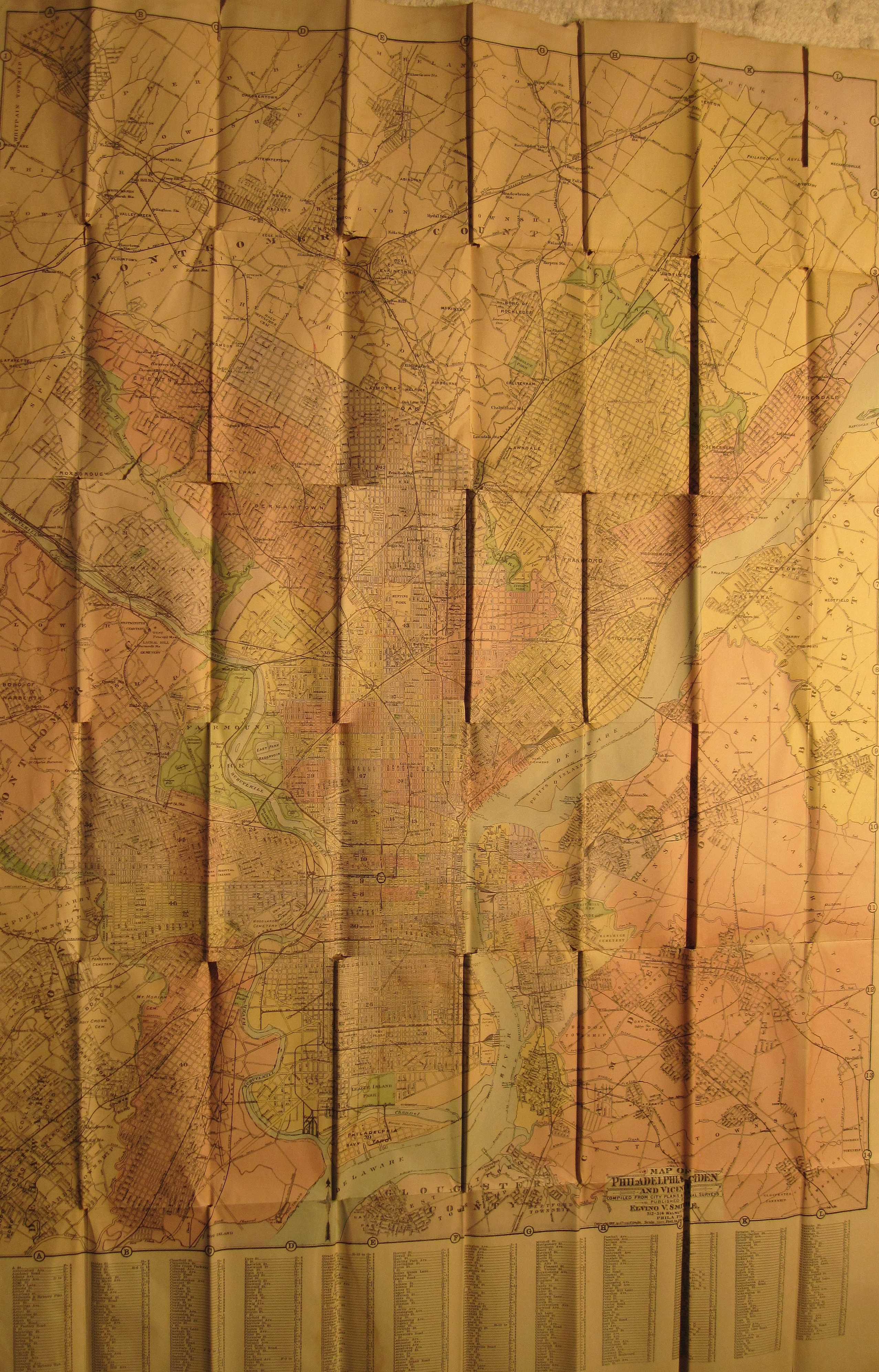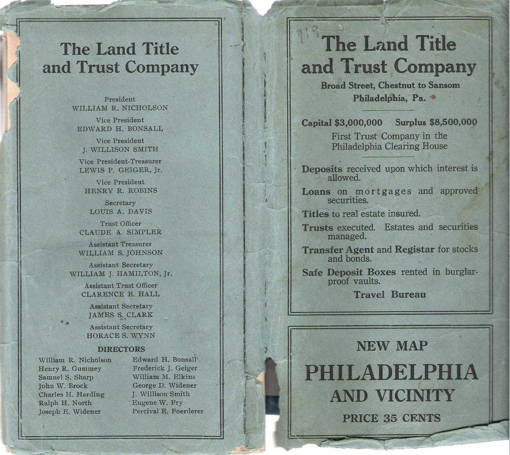 1918 MAP OF PHILADELPHIA, CAMDEN AND VICINITY COMPILED FROM CITY PLANS & PERSONAL SURVEYS. Published by Elvino V. Smith C.E. 512-514 Walnut St. Phila. Pa. Copyright 1918 by Elvino V. Smith. This is a large fine street map especially for the depiction of rail lines through the area. It includes small parts of southern Montgomery and eastern Delaware counties. There is a list of streets on the bottom whose coordinates match the grid around the edge. The map folds into a 7 x 4 inch green paper cover with the title at bottom: ‘New Map of Philadelphia and Vicinity.’ This cover is an ad for the land title and trust company whose business is described on the front and back; the inside is blank. The map is printed on ordinary, though heavy, paper; this copy has a few crease tears and is separated from the cover. Blank verso, longitude not shown. Scale: 1 inch = 3000 feet. Size: 27 x 40 inches; map only: 27 x 35 inches. |