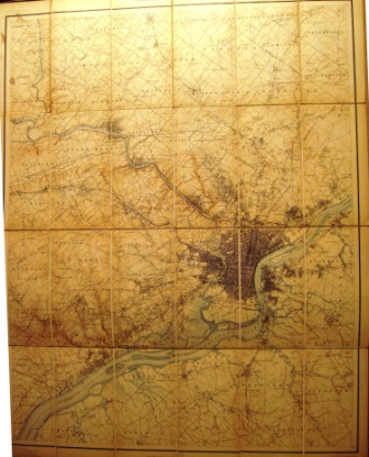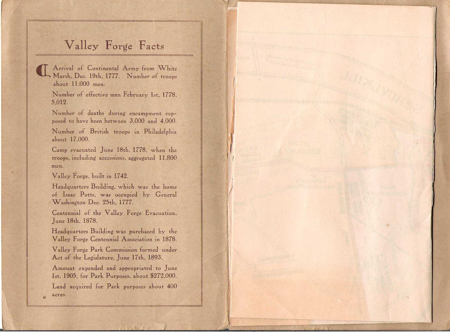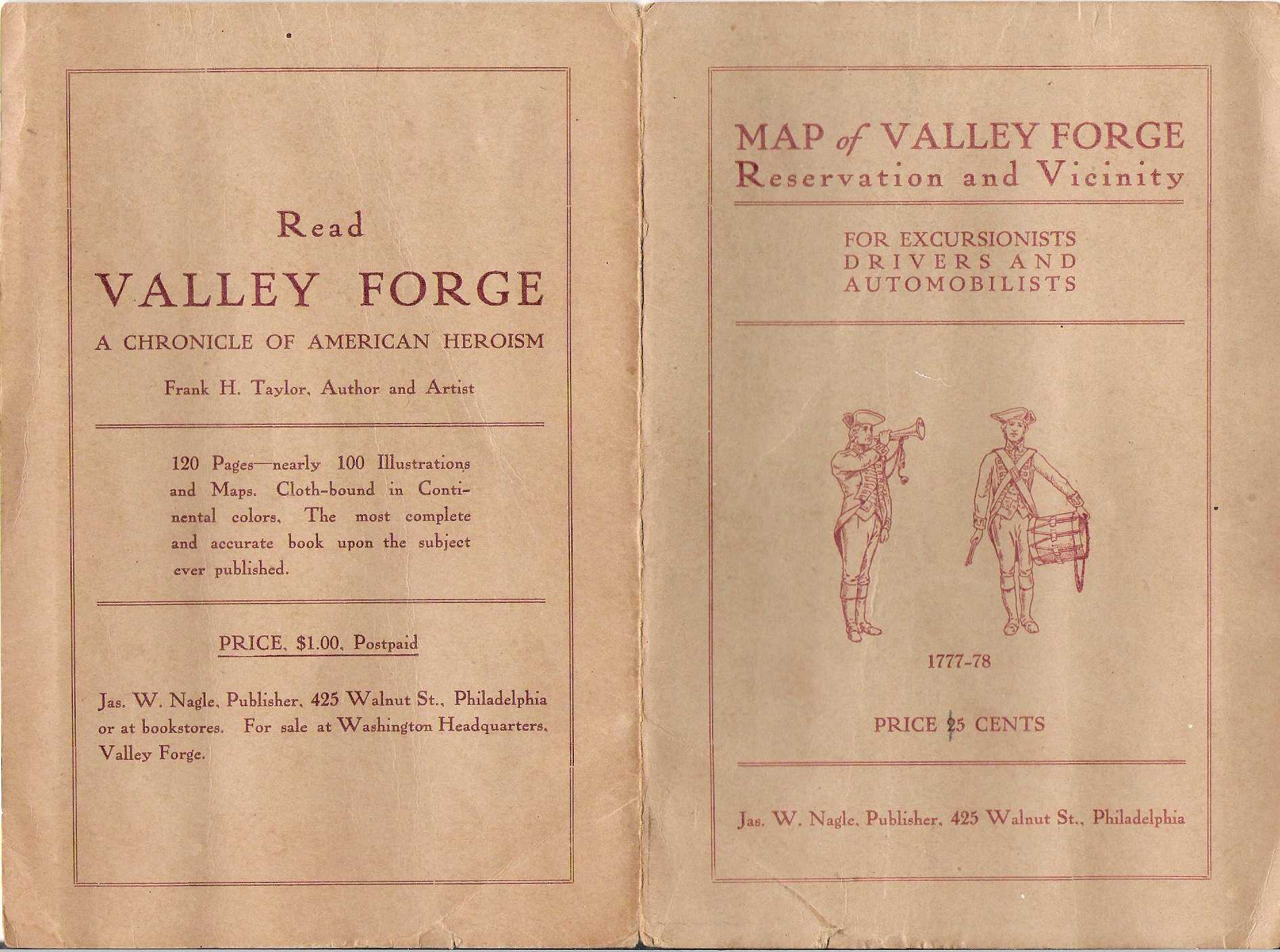 1905 MAP OF VALLEY FORGE RESERVATION AND VICINITY FOR EXCURSIONISTS DRIVERS AND AUTOMOBILISTS. Jas. W. Nagle, Publisher, 425 Walnut St., Philadelphia. The map folds into a 7 x 4.75 inch brown paper cover with the date 1905 on the inside; this date is used here, although it could come from a little later. This is really a road map for the park and the sort of pocket map replaced by the more typical automobile road maps. The Schuylkill River is at the top and the barracks layout and Washington’s Headquarters are located. Valley Forge was a work in progress when this map was made. It was established as the first state park in 1893 and the present boundaries evolved over several decades. Valley Forge was deeded to the National Park system in 1976 as a bicentennial gift to the nation from Pennsylvania. The map is printed on ordinary paper and this copy is brittle with age. Blank verso, longitude not shown. Scale: 1 inch = 800 feet. Size: 13.25 x 17 inches. |