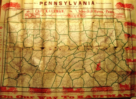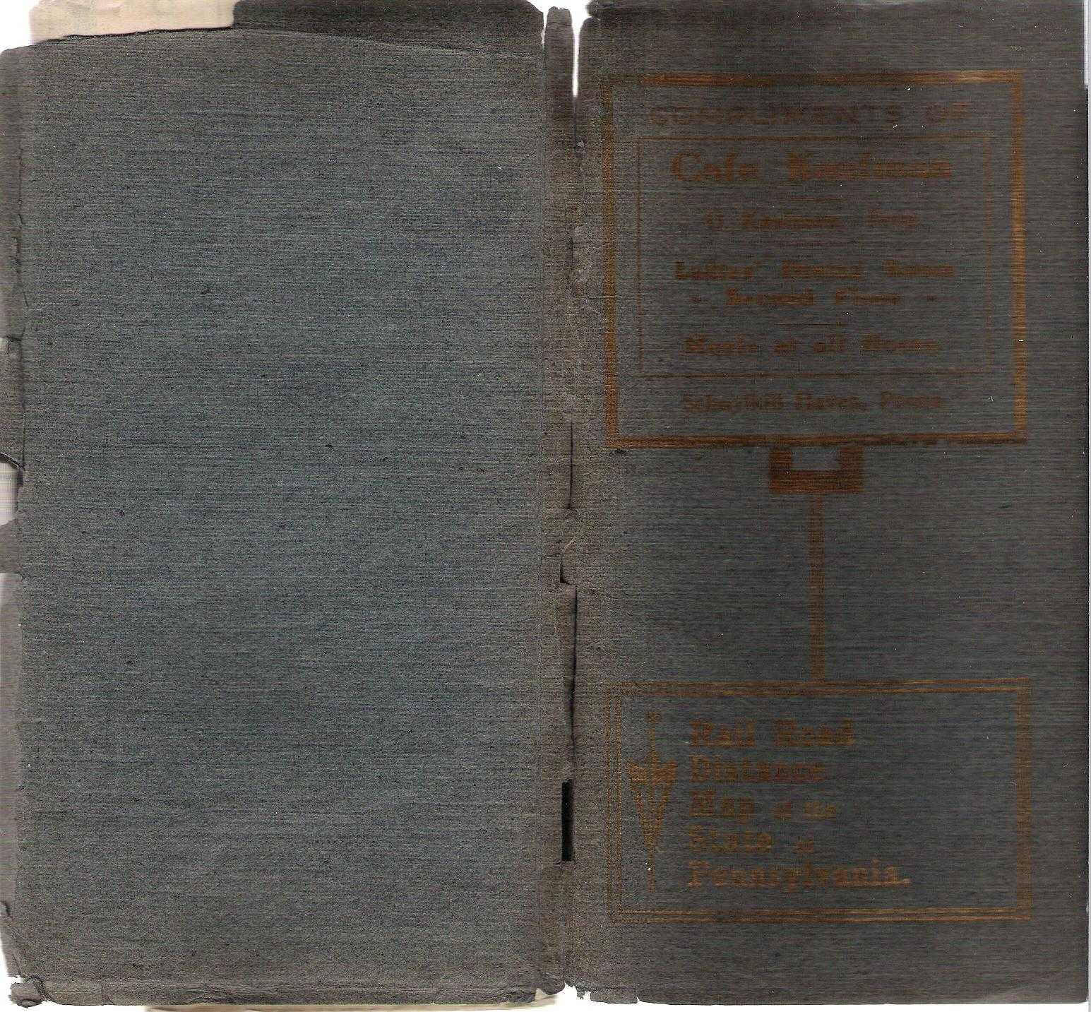1906 RAILROAD DISTANCE MAP OF PENNSYLVANIA SHOWING RAILROAD CONNECTIONS AND MILAGE BETWEEN ALL IMPORTANT CITIES AND TOWNS. Published by the Consolidated Map Co., Erie, Pa. Copyright January 26, 1906. This is an advertising map and folds into a dark, almost black, 7 x 4 inch paper cover with an ad for Café Kaufman near Pottsville. An image of a red car, an Overland Model 46, is stamped over the map around the perimeter and a large red hand shows the café location on the map. The car and hand and ad appear to be added after printing of the basic map, possibly stamped by hand. Rail lines are shown with towns and distances, no roads. The inside cover is blank. The map and cover are printed on cheap paper and this copy is in only fair condition. Blank verso, longitude not shown. Scale: 1 inch = 10 miles. Size: 27 x 40 inches. |