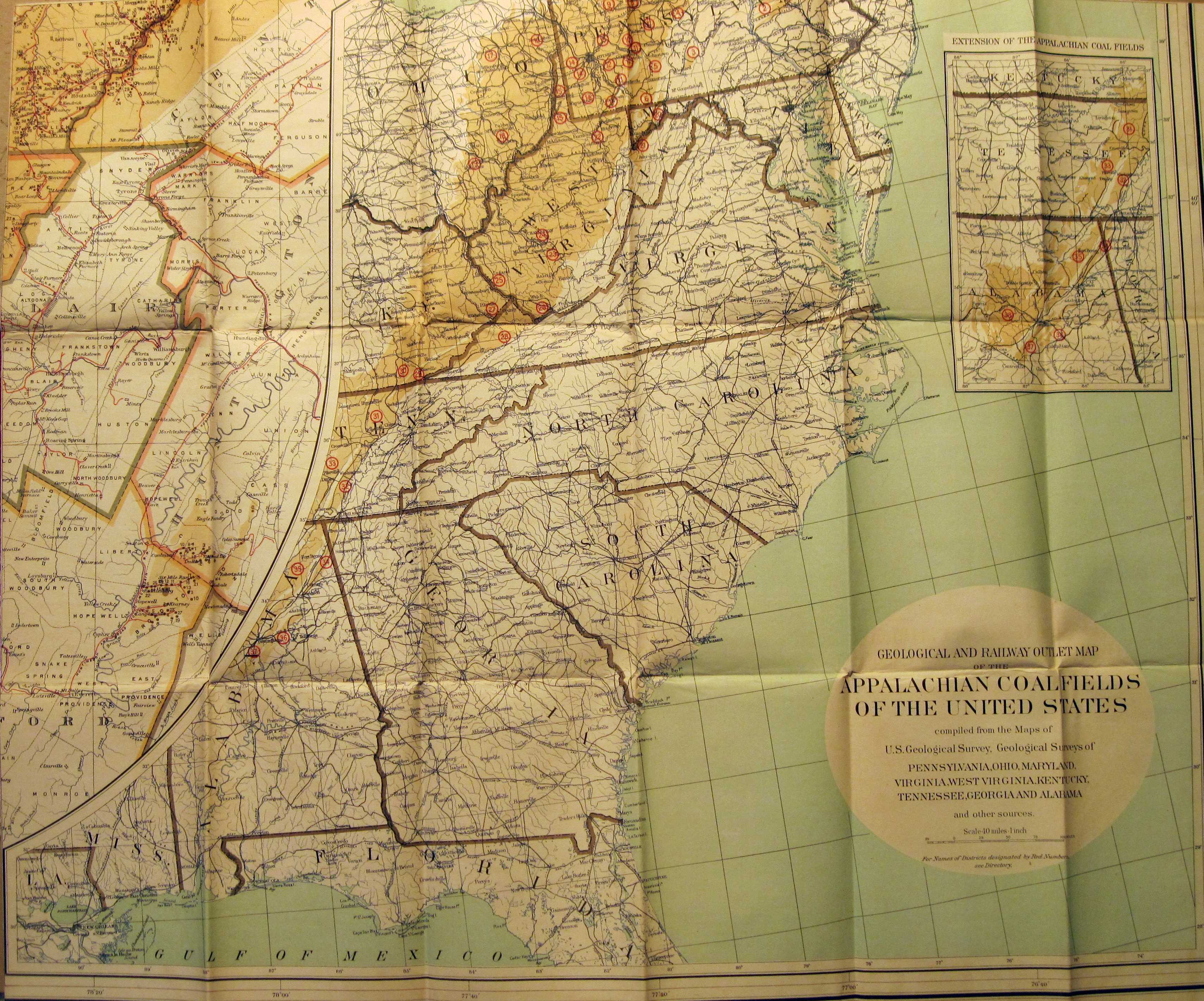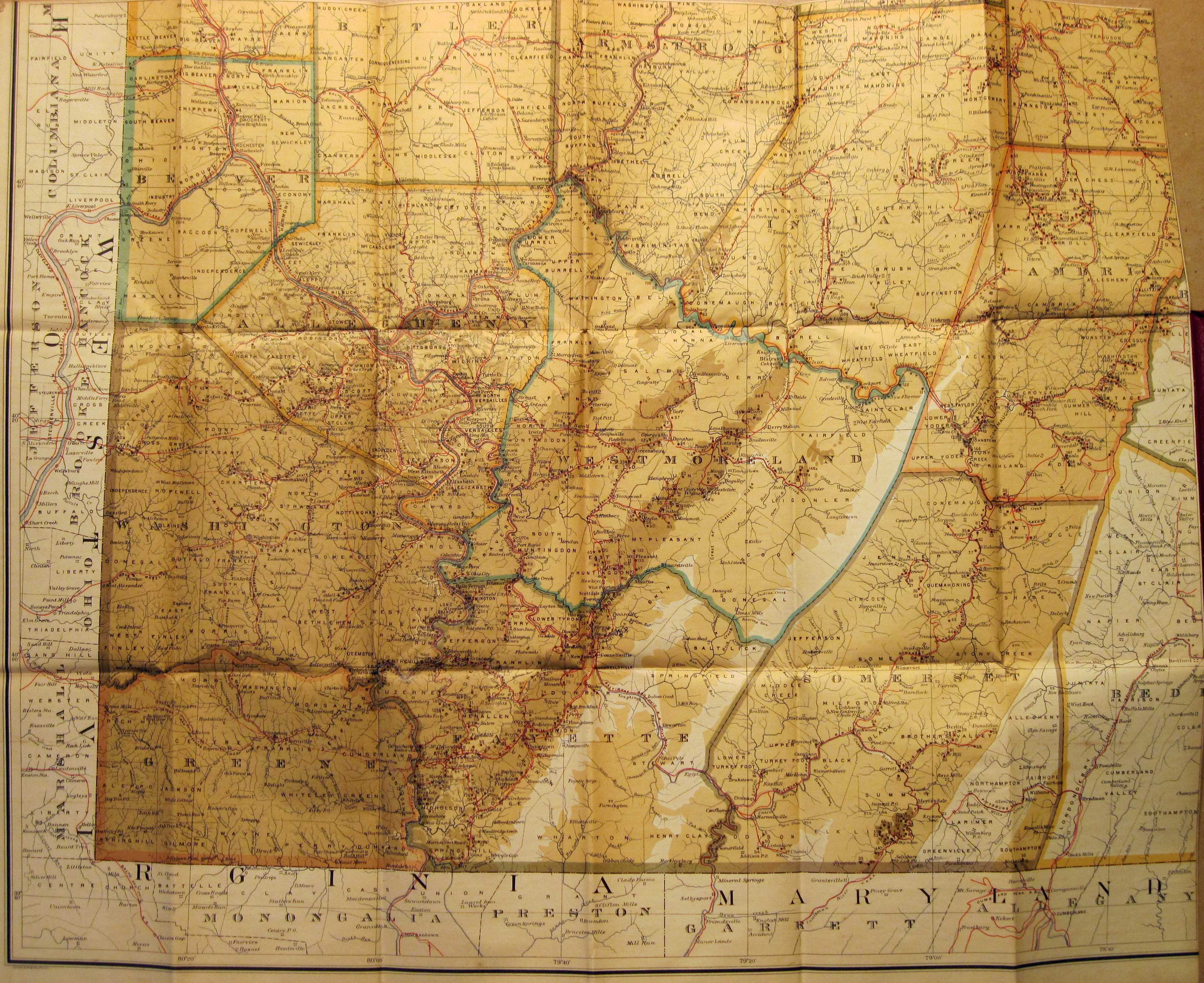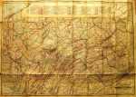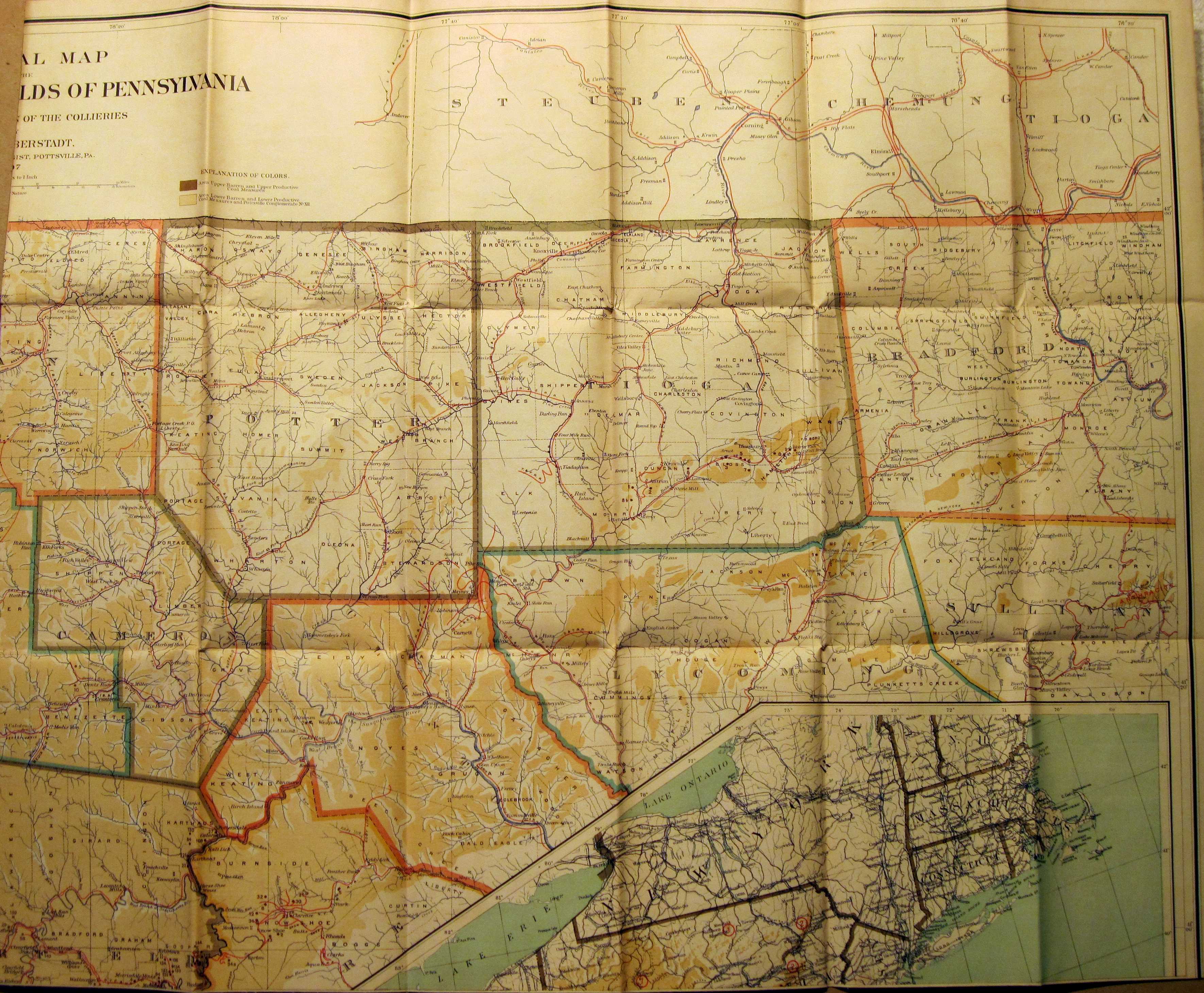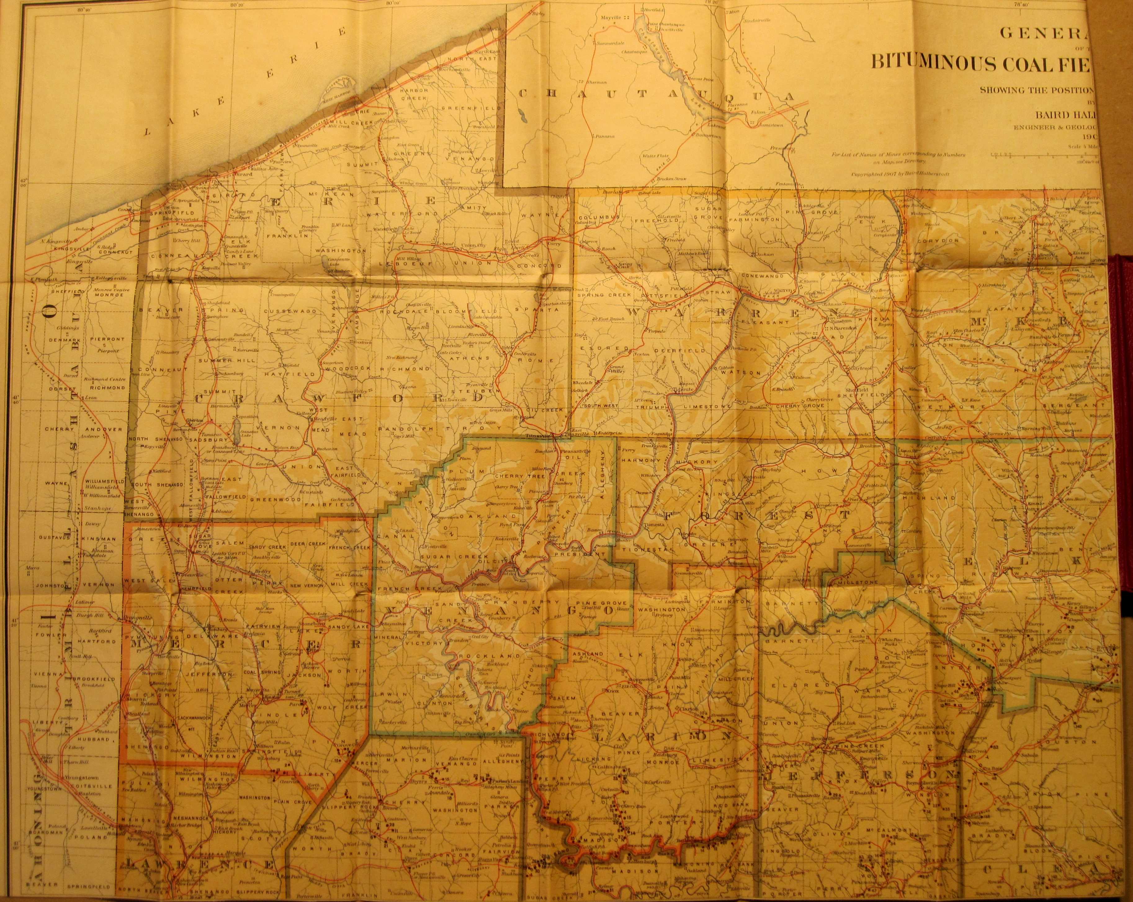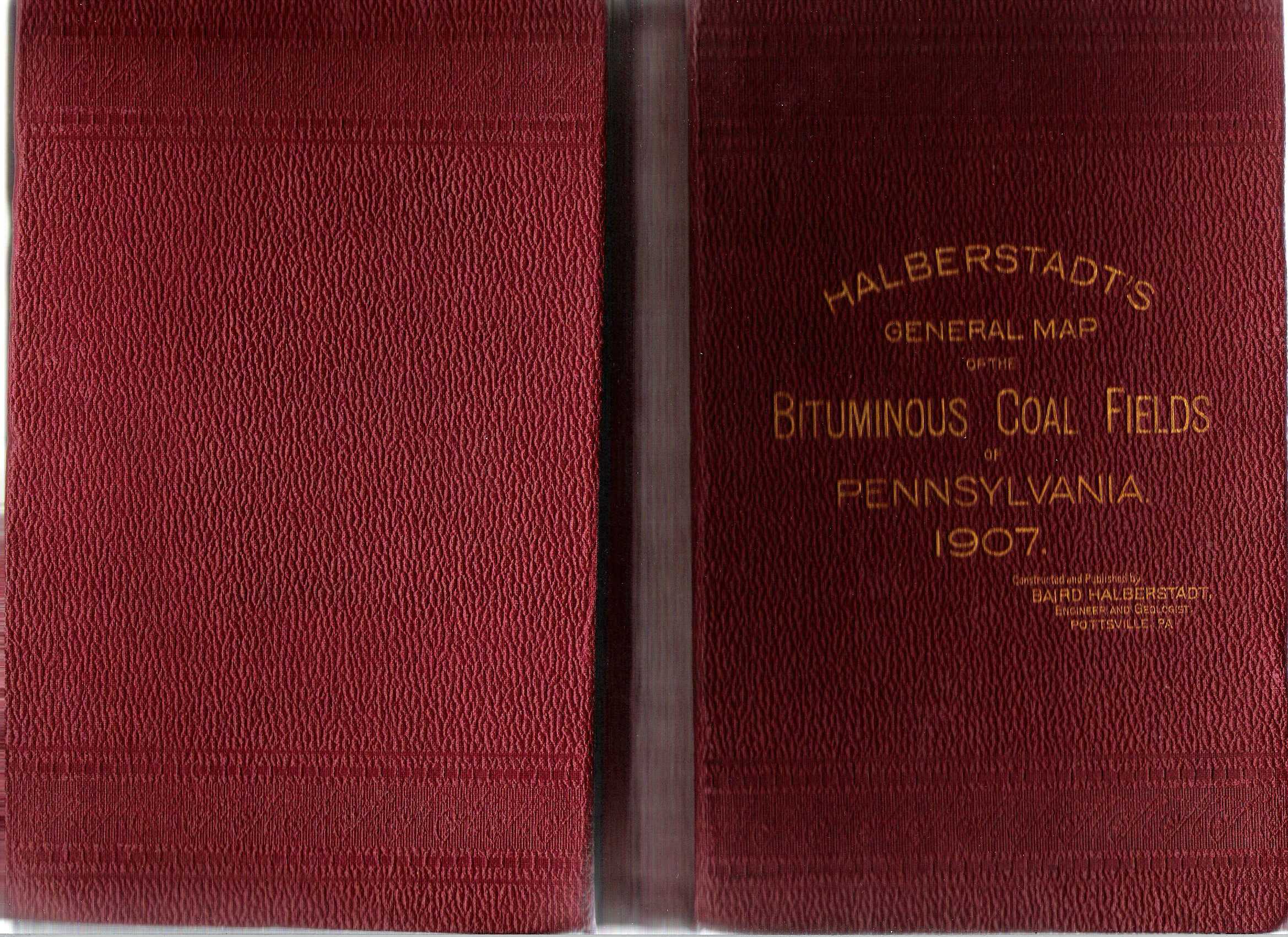1907 HALBERSTADT’S GENERAL MAP OF THE BITUMINOUS COAL FIELDS OF PENNSYLVANIA, 1907. Constructed and Published by Baird Halberstadt, Engineer and Geologist, Pottsville, Pa. Julius Bien & Co. Lith. N.Y. There are four linen backed maps folded into and attached to a 9 x 6 inch red cover with the above title. The northwest map, shown at left, is attached to the front cover. The northeast map is attached to one side of an interior cover. The southwest map is attached to the other side of the interior cover; and the southeast map, which contains mostly an inset of the eastern United States, is attached to the back cover. Each map is 24 x 29 inches and linen backed. The first two maps cover northern Pennsylvania from Ohio to Bradford County. The third map covers southwestern Pennsylvania; and the fourth map continues as far as Blair County with the rest being an insert of the eastern United States. Coal fields are identified by color coding and coal mine locations are identified by numbers explained in a separate directory. Rail lines are shown but not roads. This is an example of a pocket map produced in this format for ease of storage and use, not so much for travel. Although, perhaps mine inspectors used them. The sectioning and packaging of this map makes it easy to use, unlike some other maps described here. This map was published several times, the earliest seen was 1904, and it may have been made as a wall map also. Blank verso, longitude from Greenwich. Scale: 1 inch = 4 miles. Size (each): 24 x 29 inches. |
