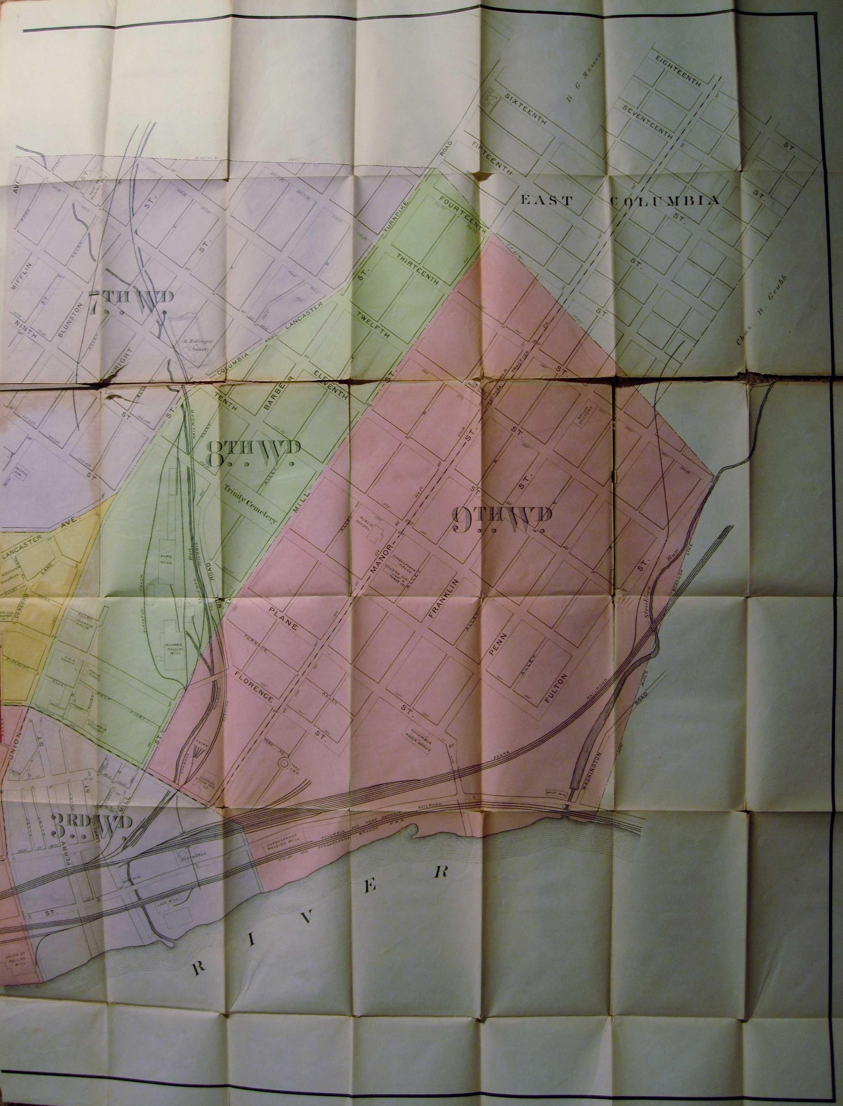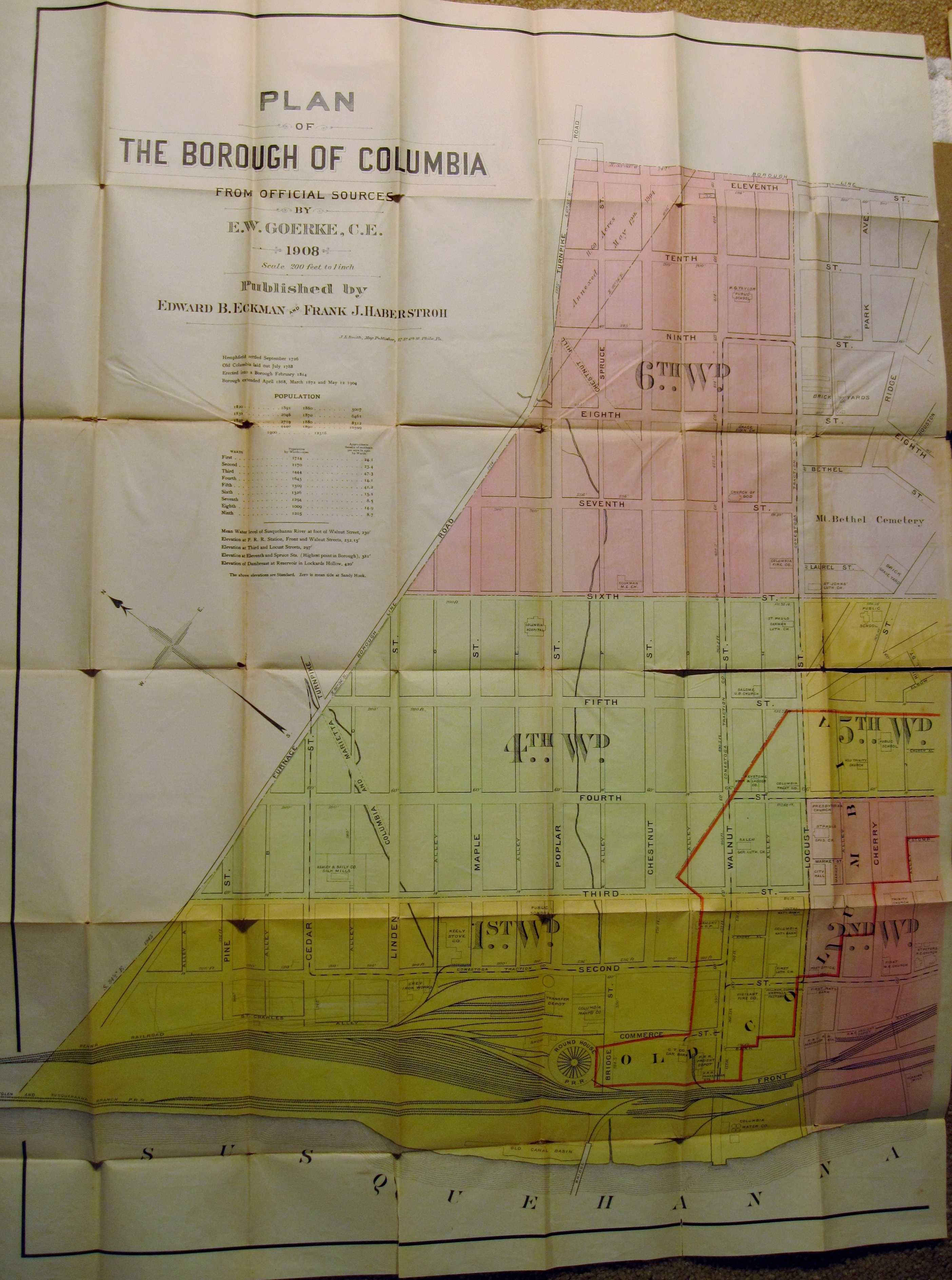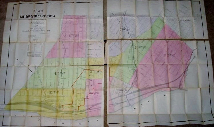 1908 PLAN OF THE BOROUGH OF COLUMBIA FROM OFFICIAL SOURCES, by E. W. Goerke, C.E. 1908. Published by Edward B. Eckman and Frank J. Haberstroh. J. L. Smith, Map Publisher, 27 So. 6th. St. Phila. Pa. The two halves of this pocket map are attached to the front and back of a 7 x 4.5 inch hard cover; both measure ~37 x 29 inches with an inch between them. The left half has the title and is on the front cover; the right half is on the back cover. Wards are numbered and indicated by color. Columbia lies along the Susquehanna River south of Harrisburg; and in the 1830s was the co-terminus of the Pennsylvania Canal and the Philadelphia and Columbia Railroad, the first railroad built in the state. Blank verso. Scale: 1 inch = 200 feet. Size (each): 37 x 29 inches. |