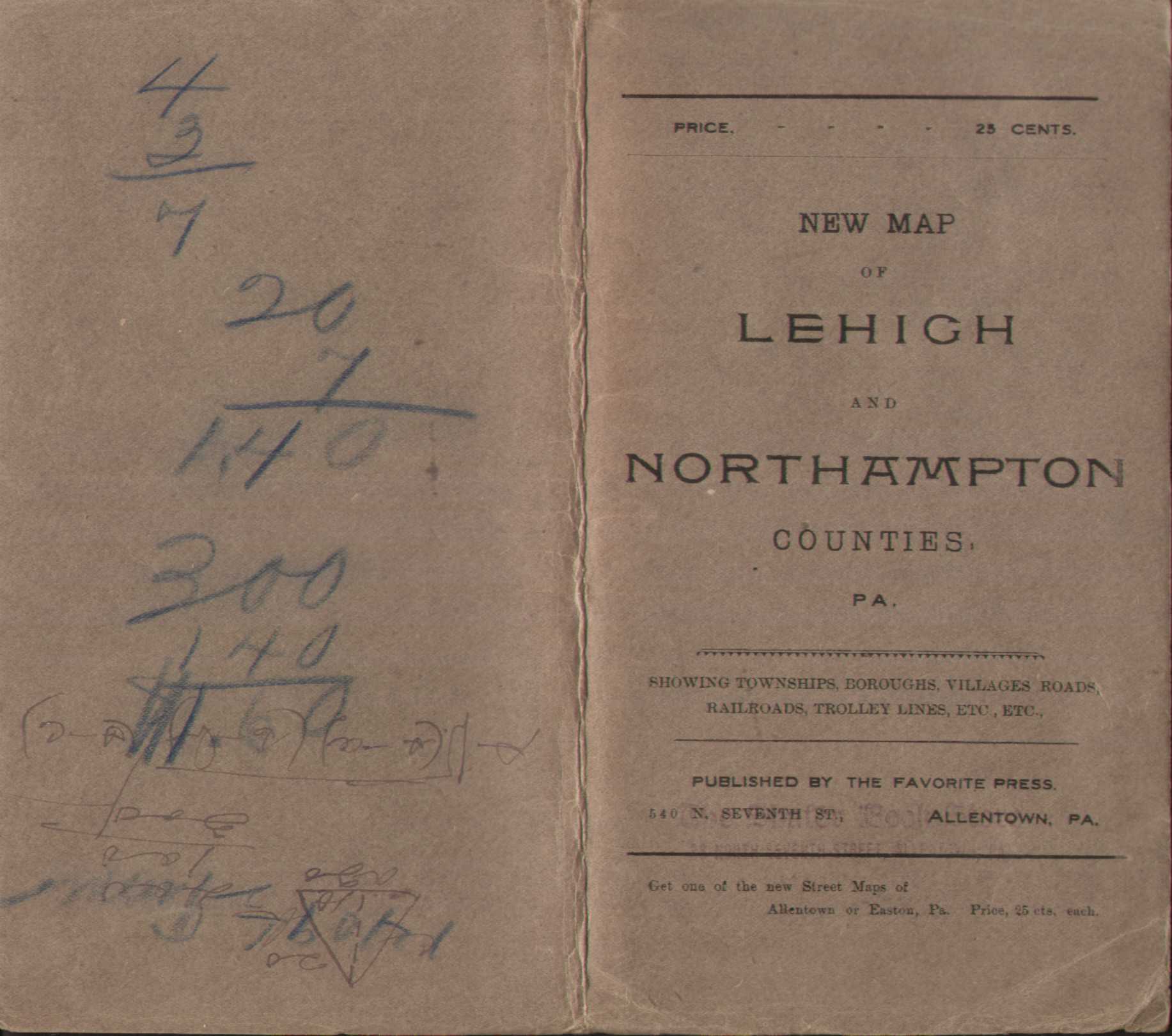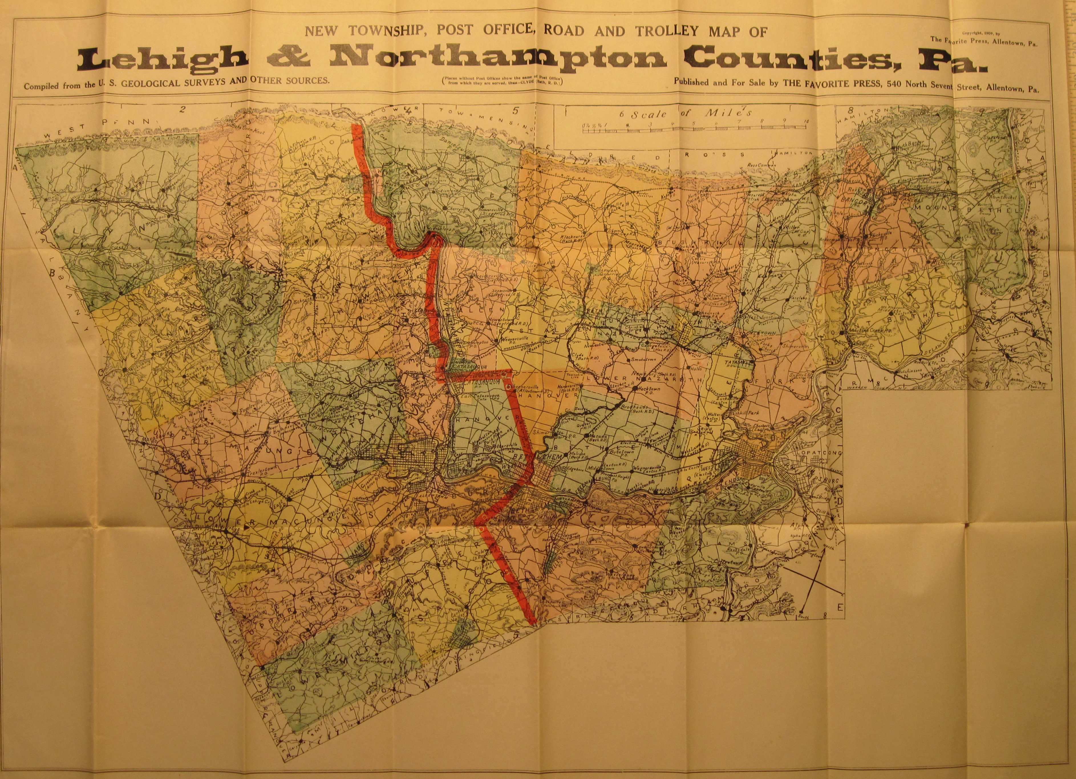 1909 NEW TOWNSHIP, POST OFFICE, ROAD AND TROLLEY MAP OF LEHIGH & NORTHAMPTON COUNTIES. Copyright 1909 by The Favorite Press, Allentown, Pa. Compiled from U. S. Geological Surveys and other sources. Published and for sale by The Favorite Press, 540 North Seventh Street, Allentown, Pa. The map folds into an 8.25 x 4.5 inch brown paper cover with the same title as the map, and the inside cover is blank. The map shows the town and road network in some detail and was issued for travelers and automobile drivers. This is the sort of local product replaced by the oil company automobile road map. The map and cover are printed on ordinary paper and this copy is still in good condition. Blank verso, longitude not shown. Scale: 1 inch = 1.5 miles. Size: 22 x 31 inches. |
