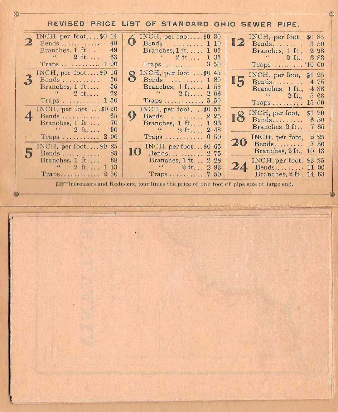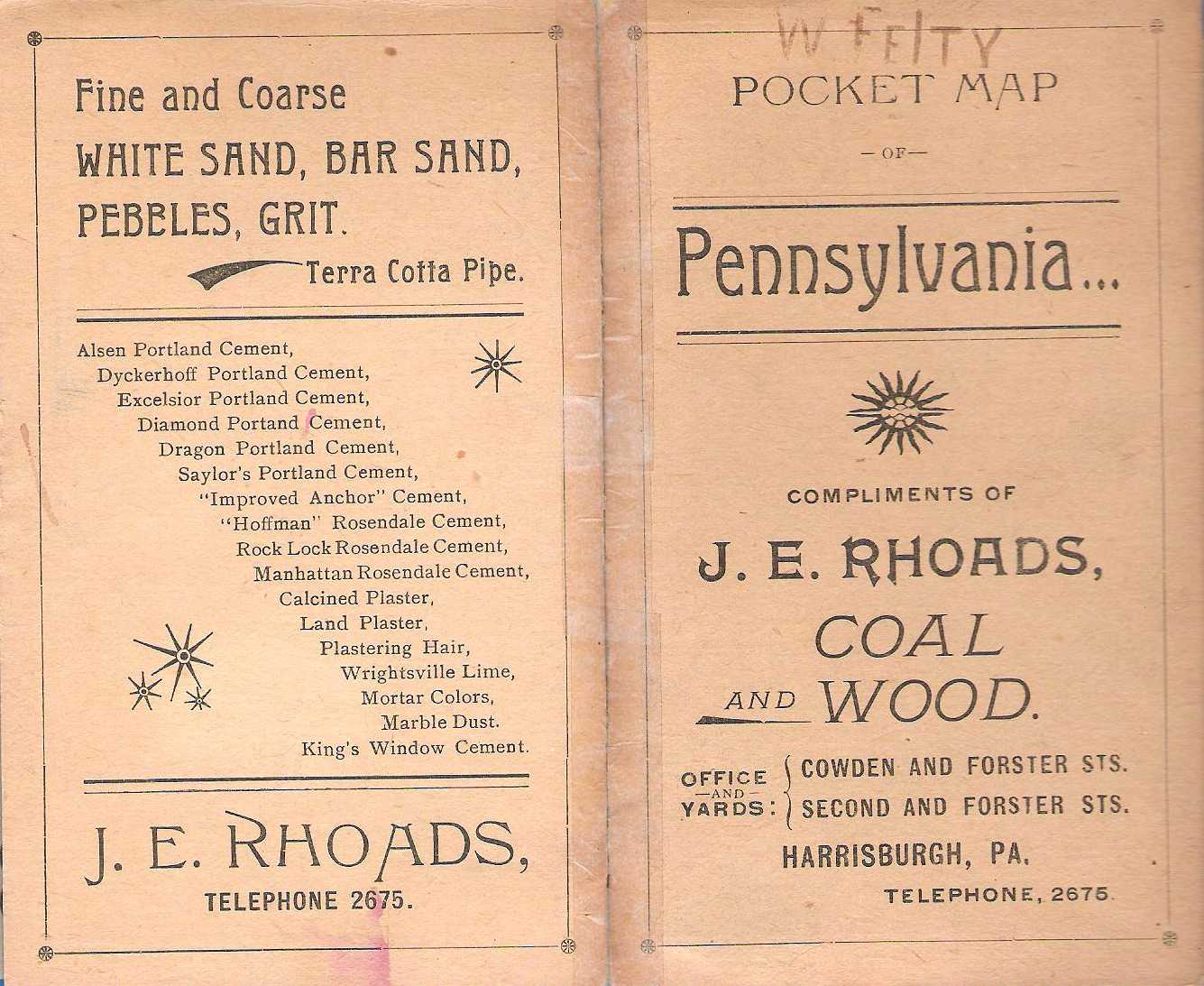 1910 POCKET MAP OF PENNSYLVANIA. Compliments of J. E. Rhoads, Coal & Wood, Harrisburg. The map folds into a 5.5 x 3.5 inch paper cover with this title. The inside cover shows the latest prices for sewer pipe. The map is titled just 'Pennsylvania’, The Jno. F. Waite Pub. Co. Engravers and Publishers, Chicago, Ill. It is printed on cheap paper and this is an example of an apparent atlas map plate used to print a map for advertising. The map shows counties by color and rail lines, no roads. The dating here is uncertain, but the cover has a phone number and phones were in regular use only after 1900 and it probably dates circa 1910. Blank verso, longitude from Greenwich at top, from Washington at bottom. Scale: 1 inch = 17 miles. Size: 13 x 20 inches. |