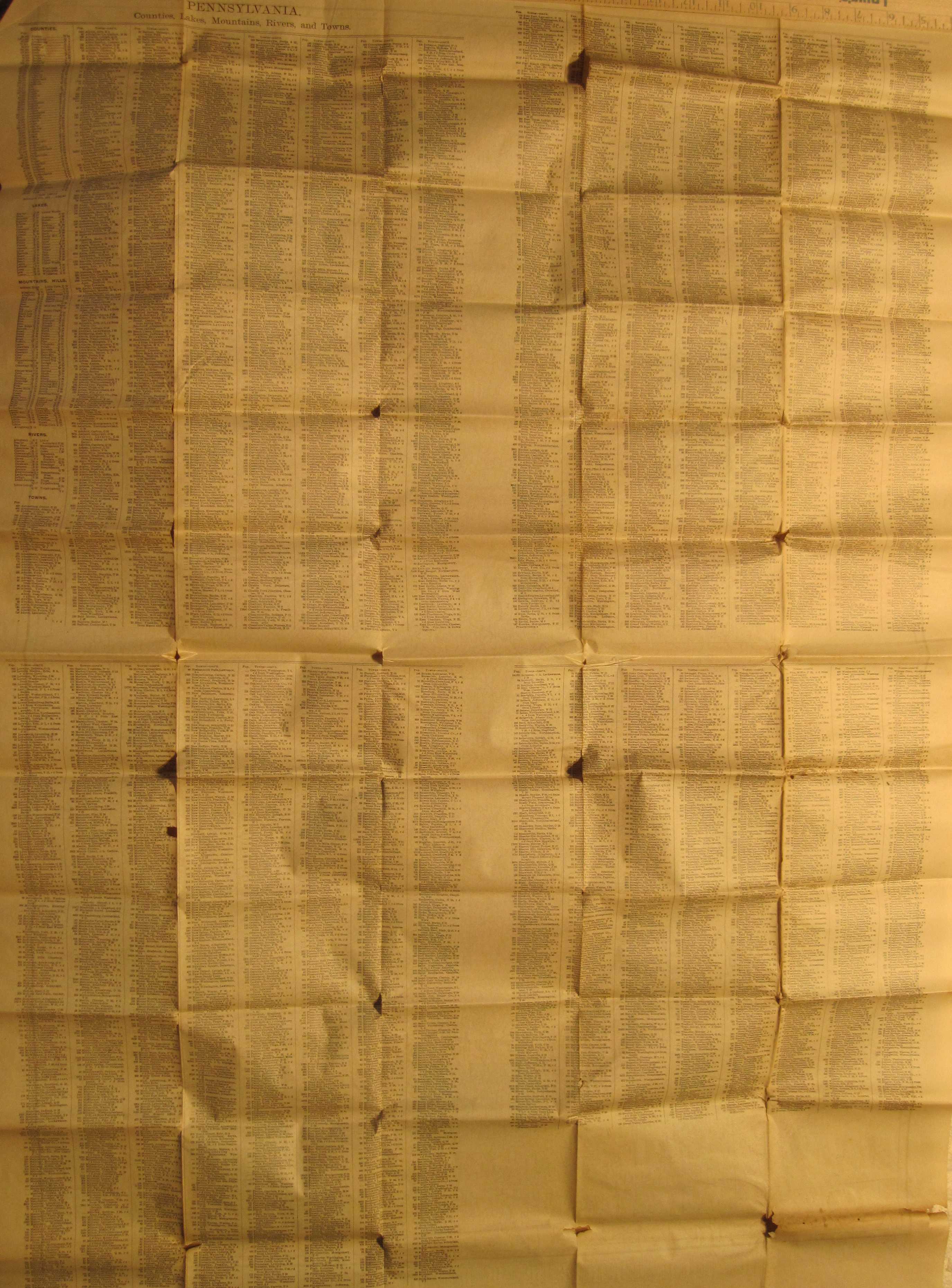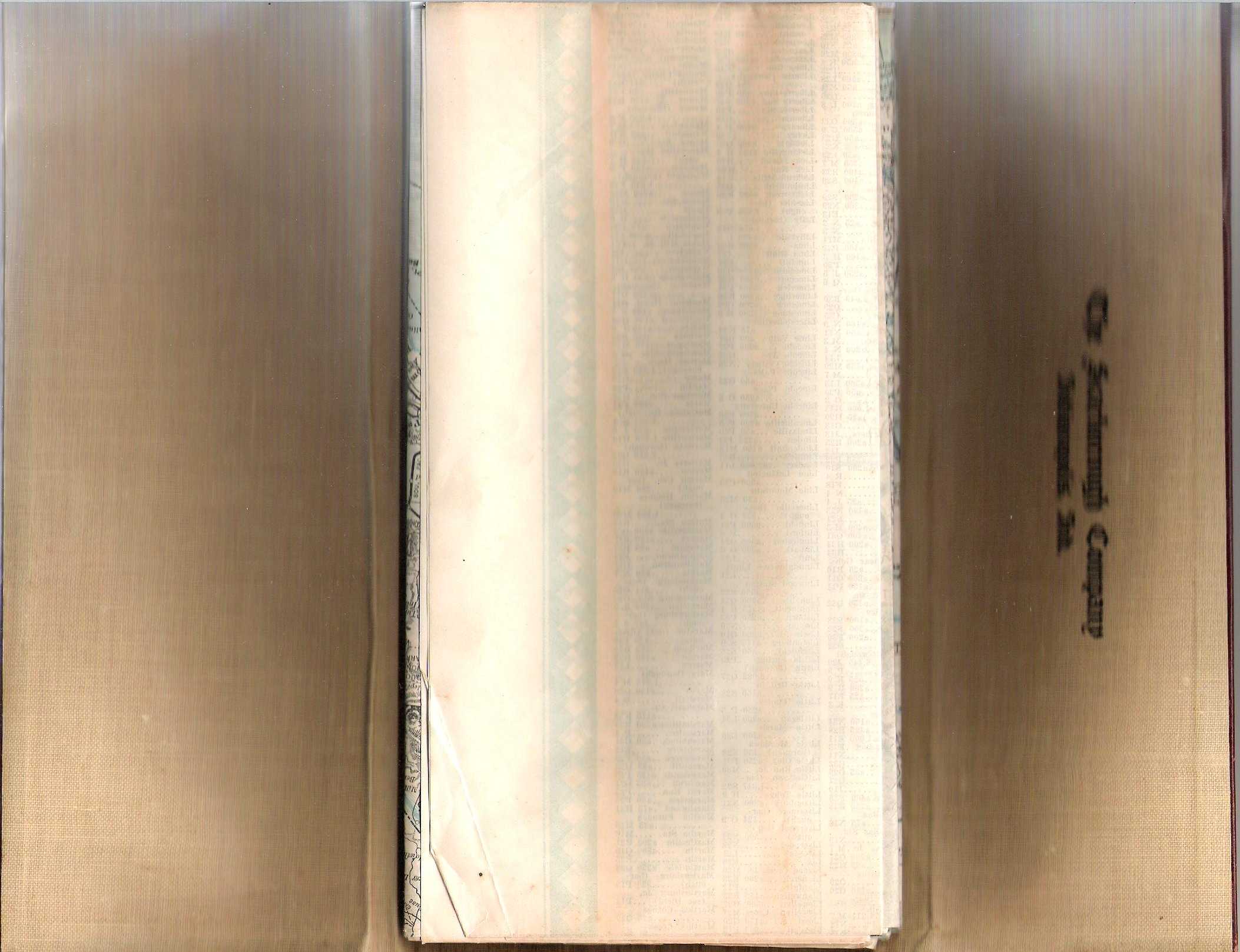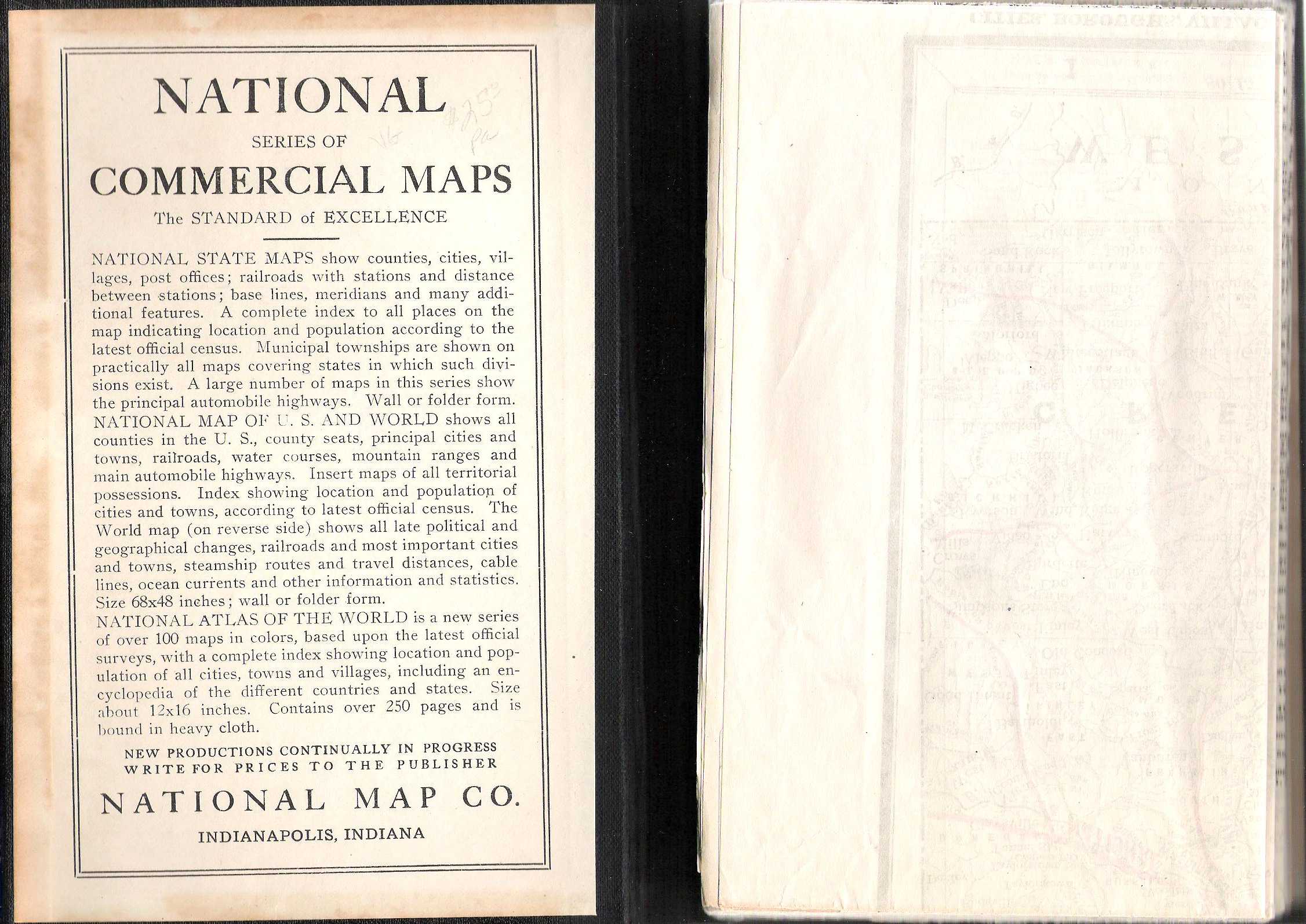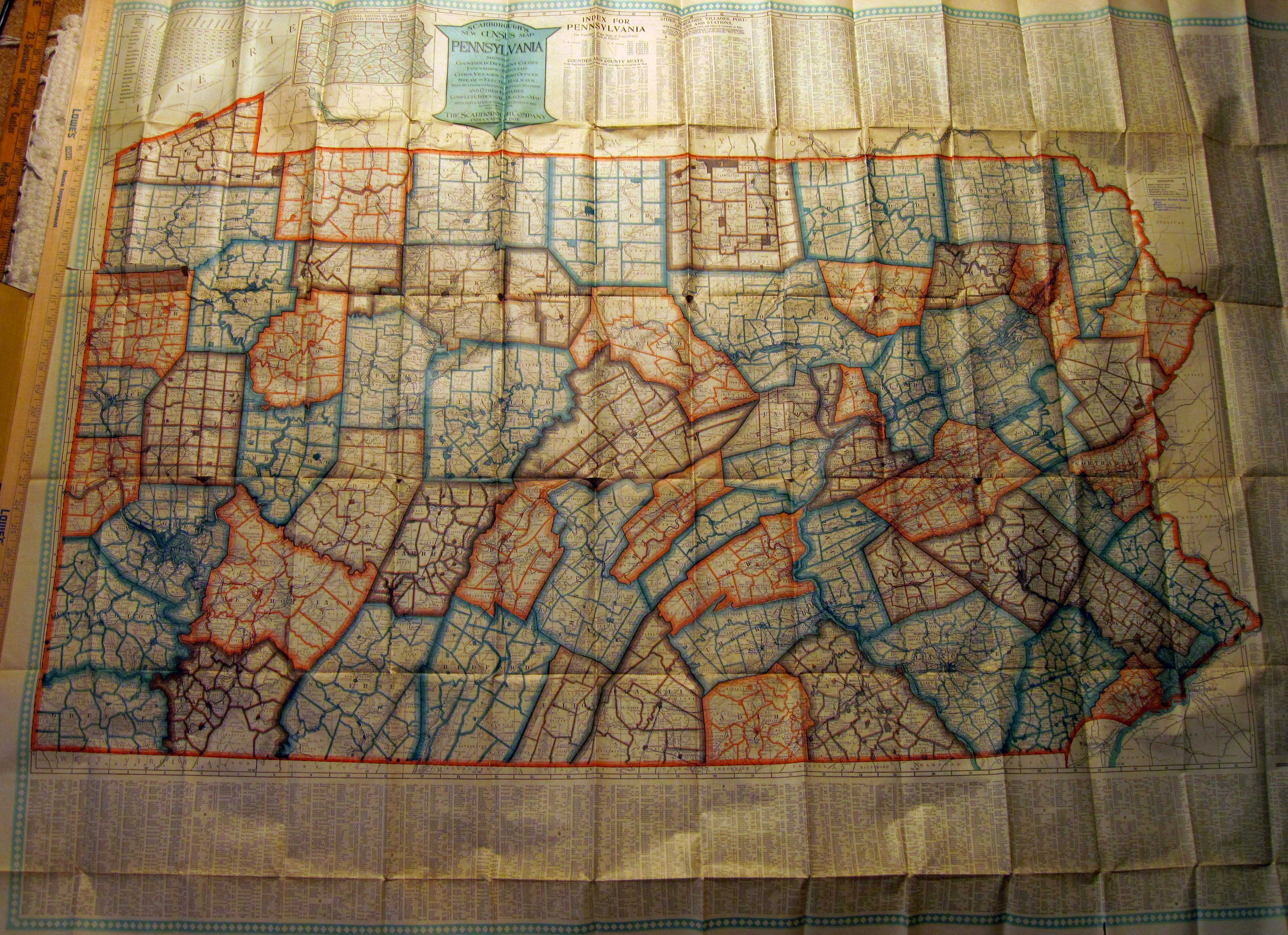 1921 PENNSYLVANIA - SHOWING COUNTIES IN DIFFERENT COLORS - TOWNSHIPS - CITIES - BOROUGHS - VILLAGES - POST OFFICES …. Published by The National Map Co., Indianapolis. The map is undated but references the 1920 census, so a date of 1921 is used here as it was probably published to reflect the latest census. This very large map includes a small inset map with congressional districts and a gazetteer of cities and towns with population on the bottom and verso. The main roads are crudely shown in broad red bands without route numbers, also indicating the map is likely circa early 1920s. Rail and electric lines are also shown. It folds into a 8.5 x 6 inch black hardback cover blank on the outside but with the ad shown at left on the inside. Cheap paper is used and the map can hardly be opened without tearing. It is also way too large for convenient use. Text on verso, longitude from Greenwich. Scale: 1 inch = 5.2 miles. Size: 48 x 60 inches. |