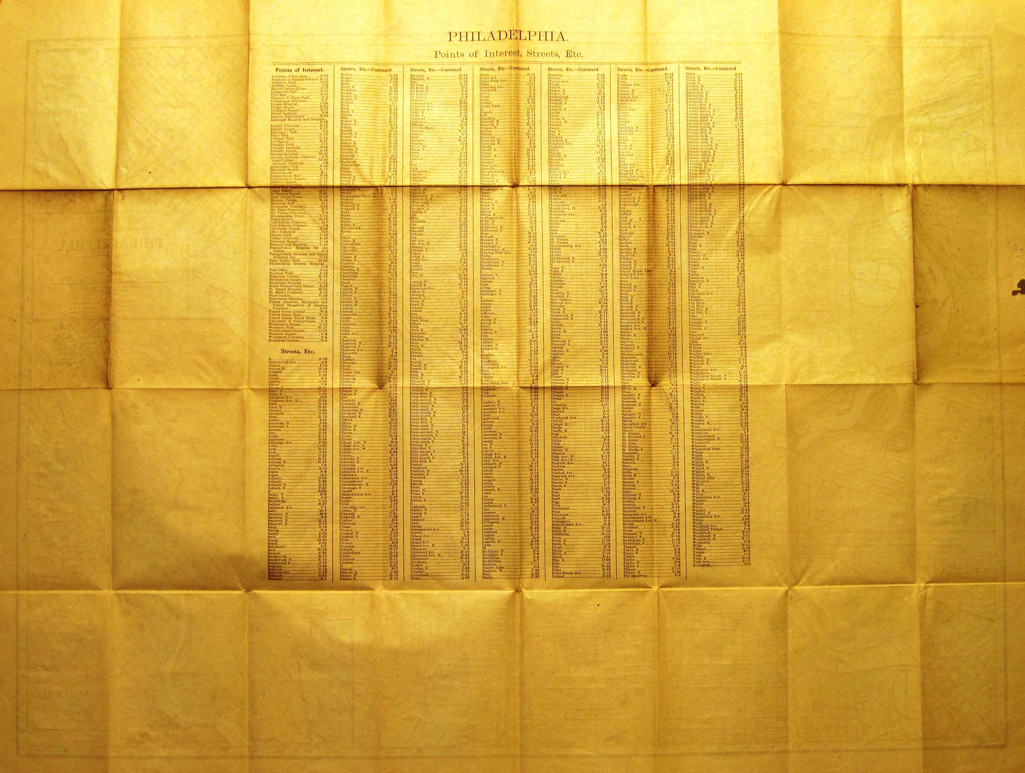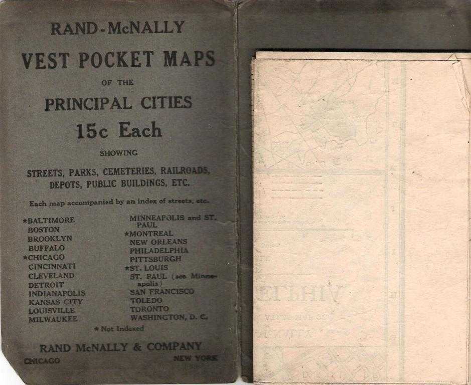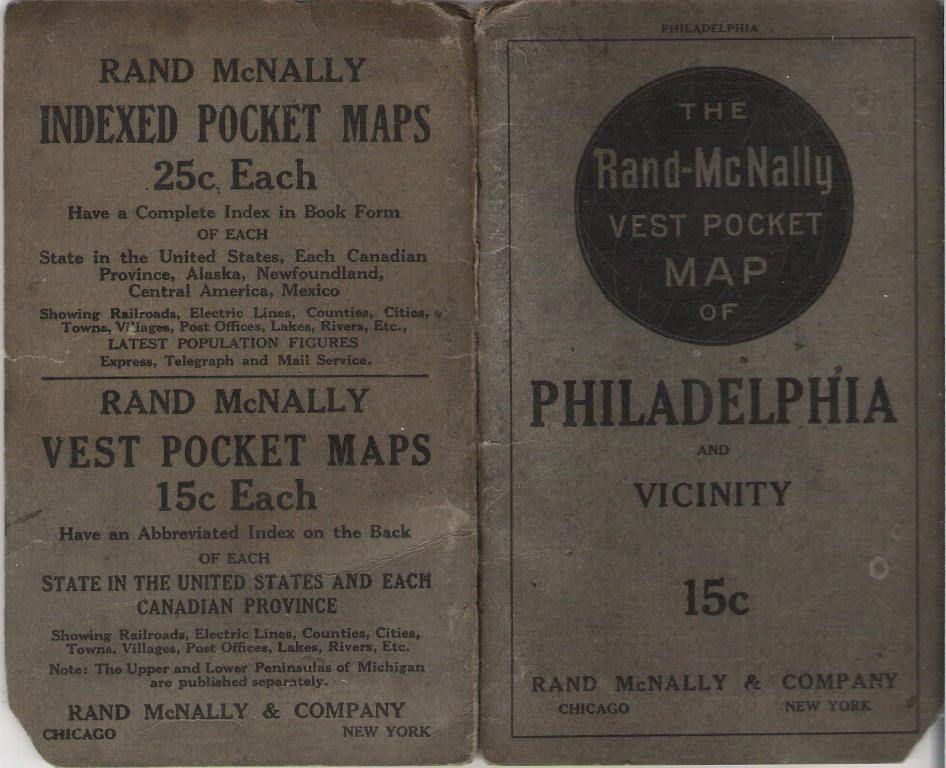 1916 THE RAND MCNALLY VEST POCKET MAP OF PHILADELPHIA AND VICINITY. Rand McNally & Company. This title is on the 6 x 4 inch dark gray paper cover to which the map was attached, now loose in this copy. Inside the front cover is a list of other cities covered including Pittsburgh. The Pennsylvania version is shown above. The map title is “The Rand McNally New Commercial Atlas Map of Philadelphia” and would indicate an atlas plate was used. However, the red overlays showing public transport lines etc., is an over-print and may be original for the intended user of a pocket map. This is a street map with a grid around the edge and a matching street gazetteer on the verso. There is a smaller scale inset map showing the distribution of electric lines, new at this time, through the city indicated by red overlay. The map and cover are printed on ordinary paper and this copy is still in good condition. Text on verso, longitude not shown. Scale: 1 inch = 0.3 miles. Size: 18.5 x 25.5 inches. |