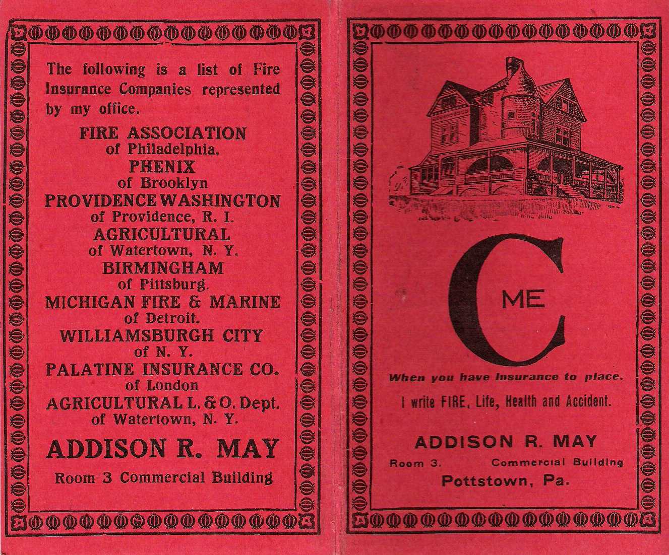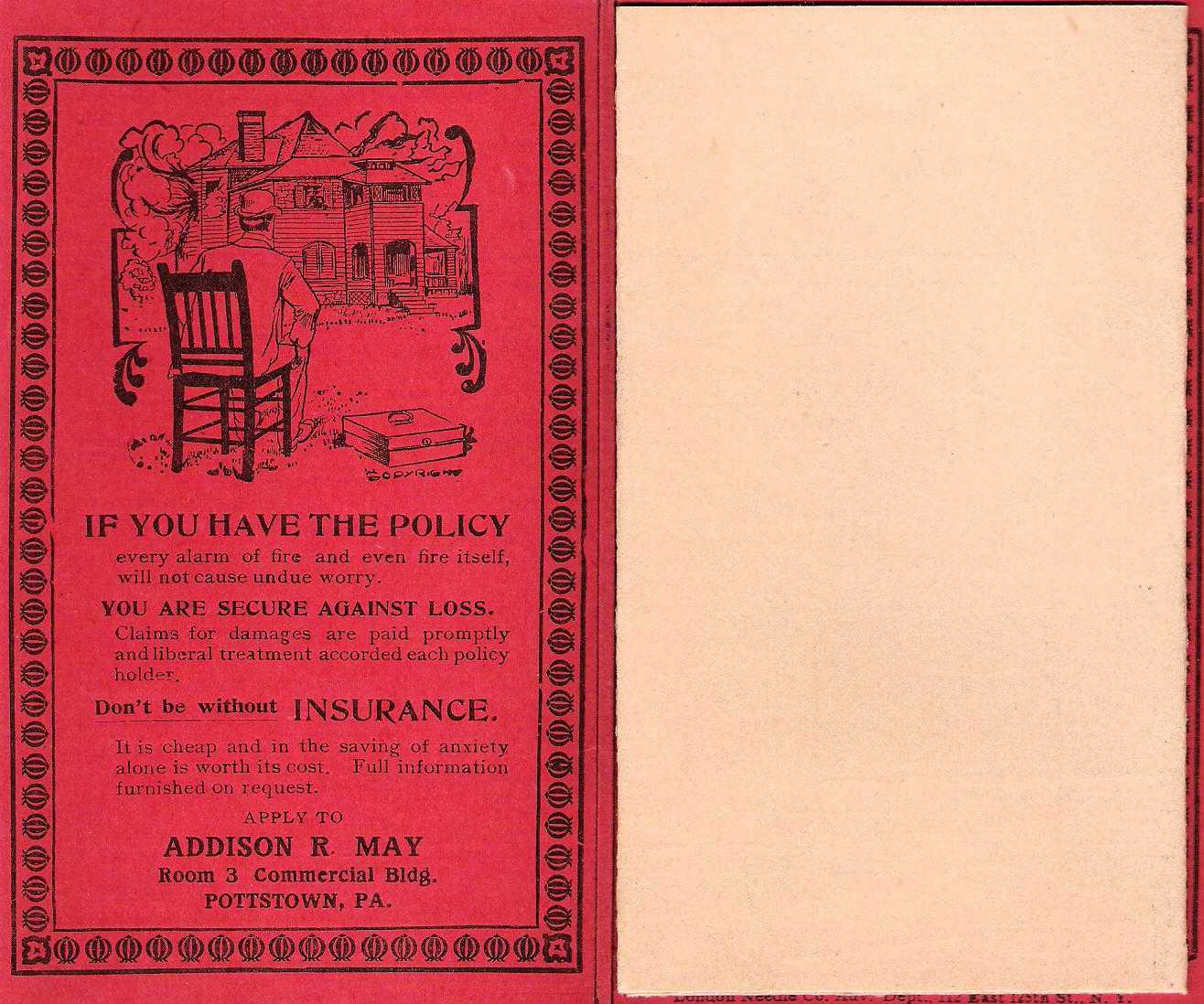 1925 PENNSYLVANIA. C. S. Hammond & Co., New York. This is a folding map titled ‘Hammond’s 8 x 11 Map of Pennsylvania’ in small letters at the bottom. It folds into a 5.5 x 3.25 inch red paper cover with the advertisements shown at left. There are ads for the same insurance company inside, including underneath the map which cannot be seen without separating the map from the back cover. This map was likely made from a plate used for atlas maps and perhaps other uses by Hammond; but it is undated and could date anywhere circa 1920-30. Printed on ordinary cheap paper, it is typical for the pocket map as an ephemeral ad medium. Blank verso, longitude from Greenwich. Scale: 1 inch = 28 miles. Size: 8 x 11 inches. |