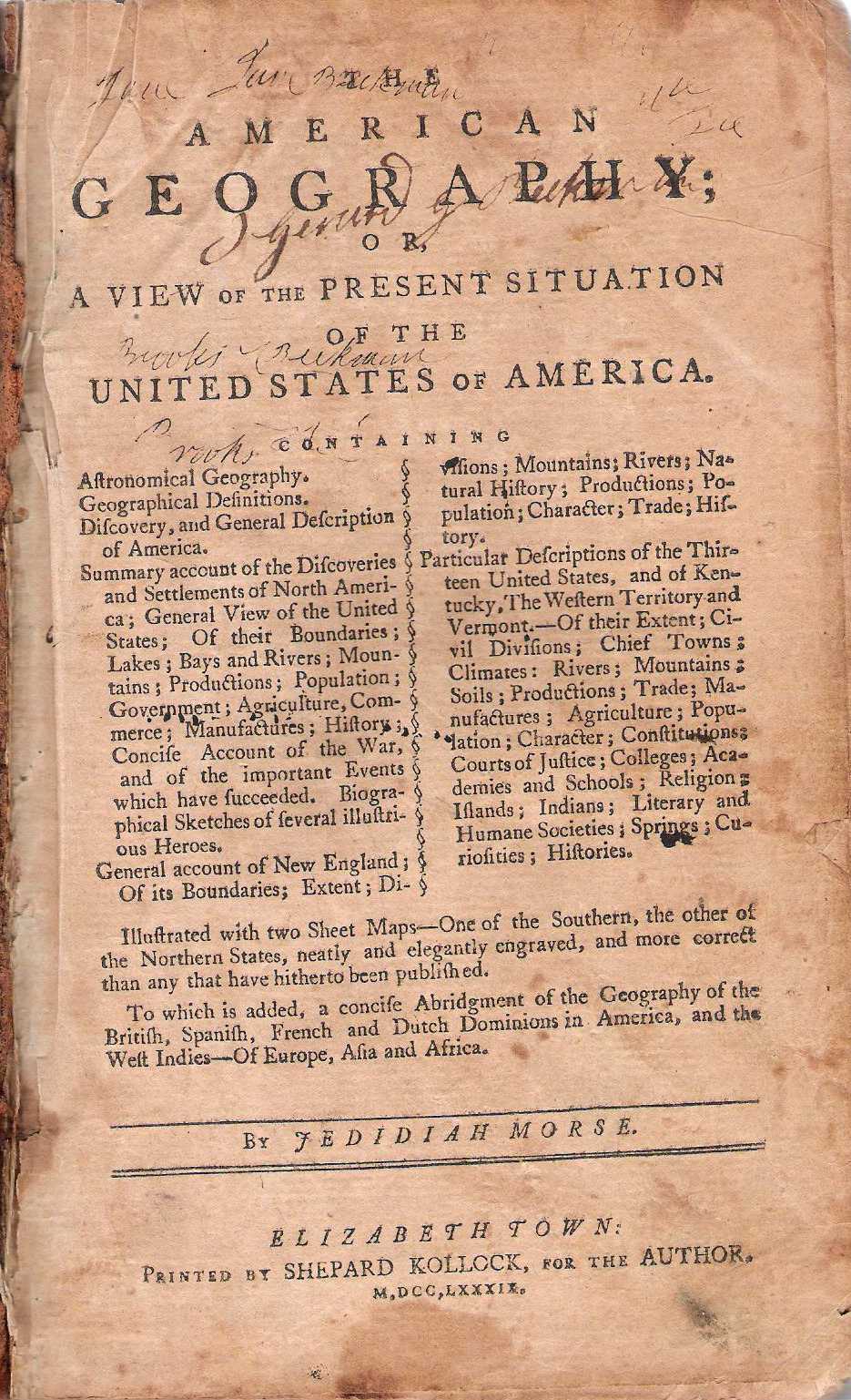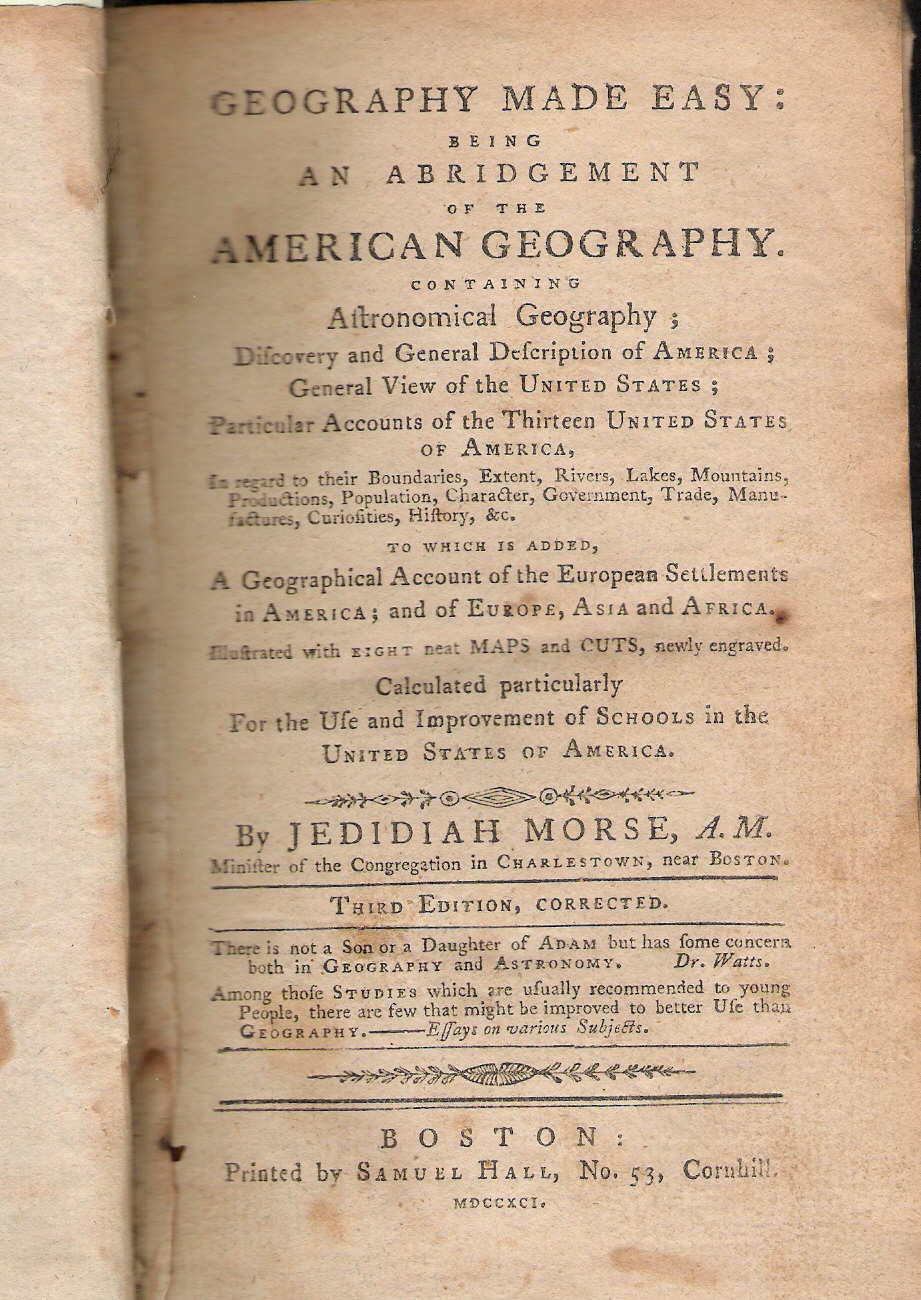 1791 Geography Made Easy: Being an abridgement of the American Geography. Containing Astronomical Geography; Discovery and General Description of America, General View of the United States, ...by Jedidiah Morse, A.M. Minister of the Congregation in Charlestown, near Boston. Third Edition, corrected. Boston: printed by Samuel Hall, No. 53, Cornhill. MDCCXCI. The spine title is simply Morse's Geography. This edition of Morse's textbook has 323 numbered pages and contains 8 maps:1) World; 2) Solar System; 3) Figure of the Earth; 4) United States (described below); 5) South America; 6) Europe; 7) Asia; 8) Africa. Usually, some of the maps are missing in surviving copies. The famous first edition appeared in 1784 (see map 1784.2 in 18th Century Maps ) and the second in 1790. The fourth edition appeared in 1794 printed by Thomas & Andrews, Boston. The book continued in publication until the 1820s reaching over 20 editions, the later ones co-authored by Jedidiah's son, Sidney Edwards Morse. (Jedidiah's other son, Samuel Finley Breese Morse, was a noted painter and in his spare time invented the telegraph and 'Morse Code.') Morse's American Geography, a more 'scientific' work, first appeared in 1789. In this book, the description of Pennsylvania appears on the following pages: 145 , 146-147 , 148-149 , 150-151 , 152-153 , 154-155 , 156-157 , 158-159 , 160 . Printed in letterpress relief. Size: 7 x 4.25 inches. |