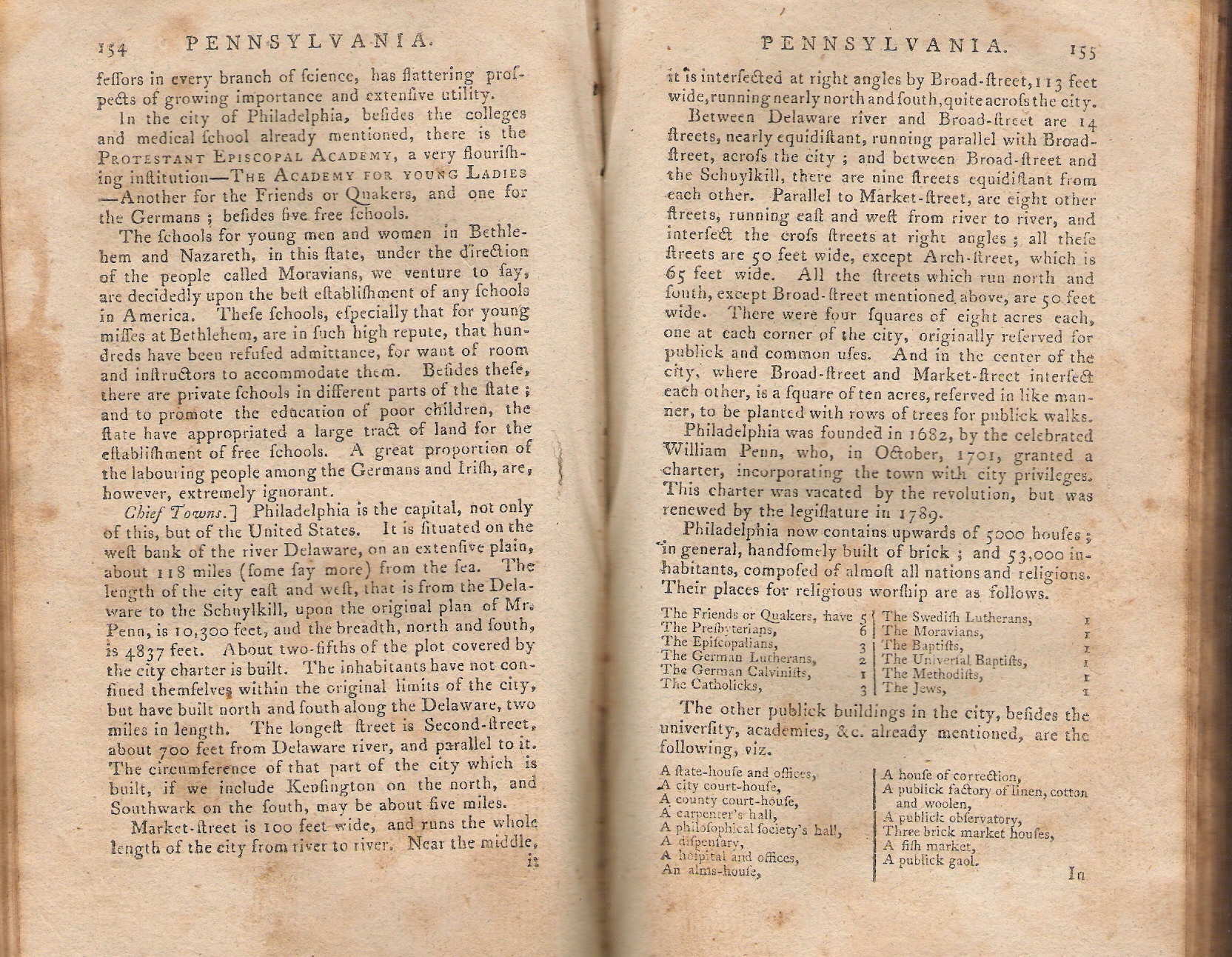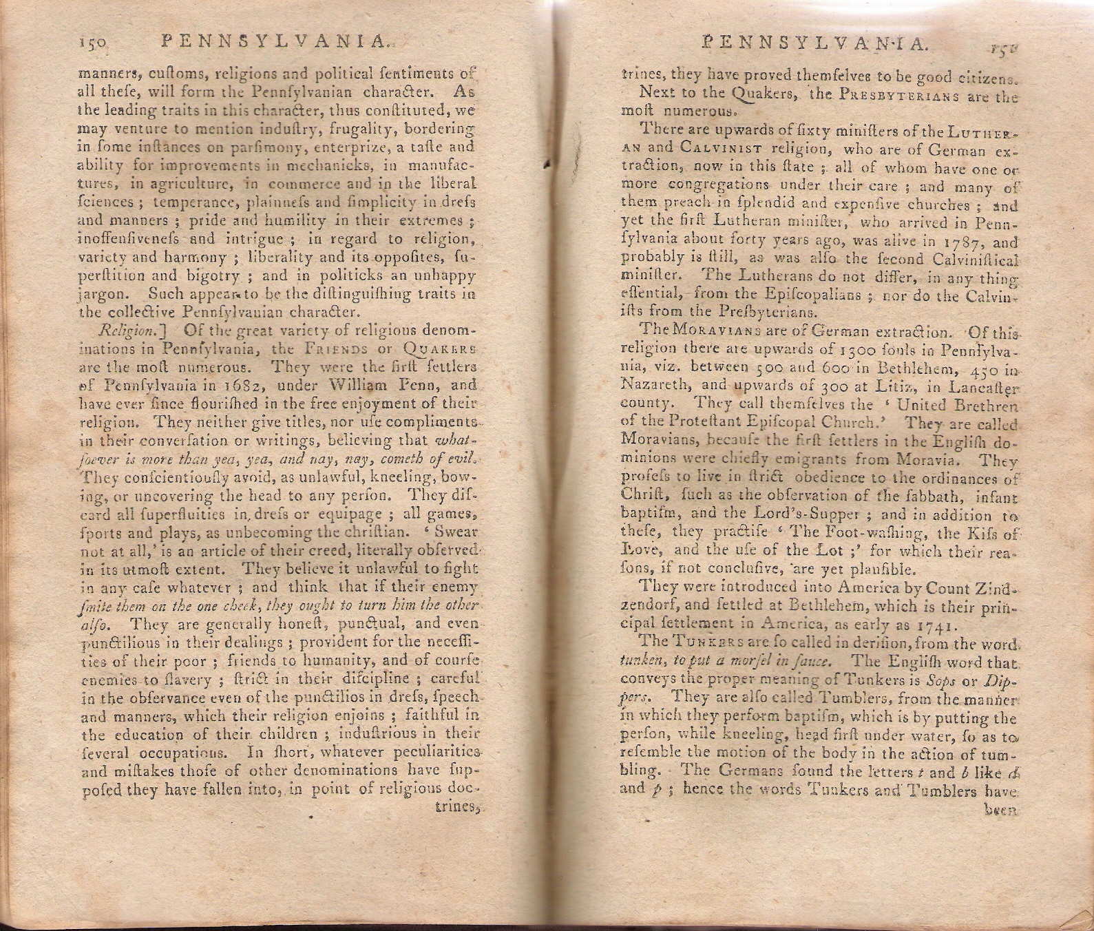 1789 The American Geography; or, A View of the Present Situation of the United States of America. by Jedidiah Morse. Elizabeth Town: Printed by Shepard Kollock, for the Author. M,DCC,LXXXIX. (1789). This is the first edition of this Morse geography, which was more didactic and influential than his earlier and concurrent Geography Made Easy. Its 536 pages have a more detailed description of the United States and some other countries and it came with two maps both missing in this copy: a map of the northern states (see Map 1789.3 in 18th Century Maps) and one of the southern states. The extensive Pennsylvania description extends from page 302 to 344 and only the early pages are shown here: 302-303 , 304-305. The third edition of 1796 is described below. Printed in letterpress relief. Size: 8 x 5 inches. |