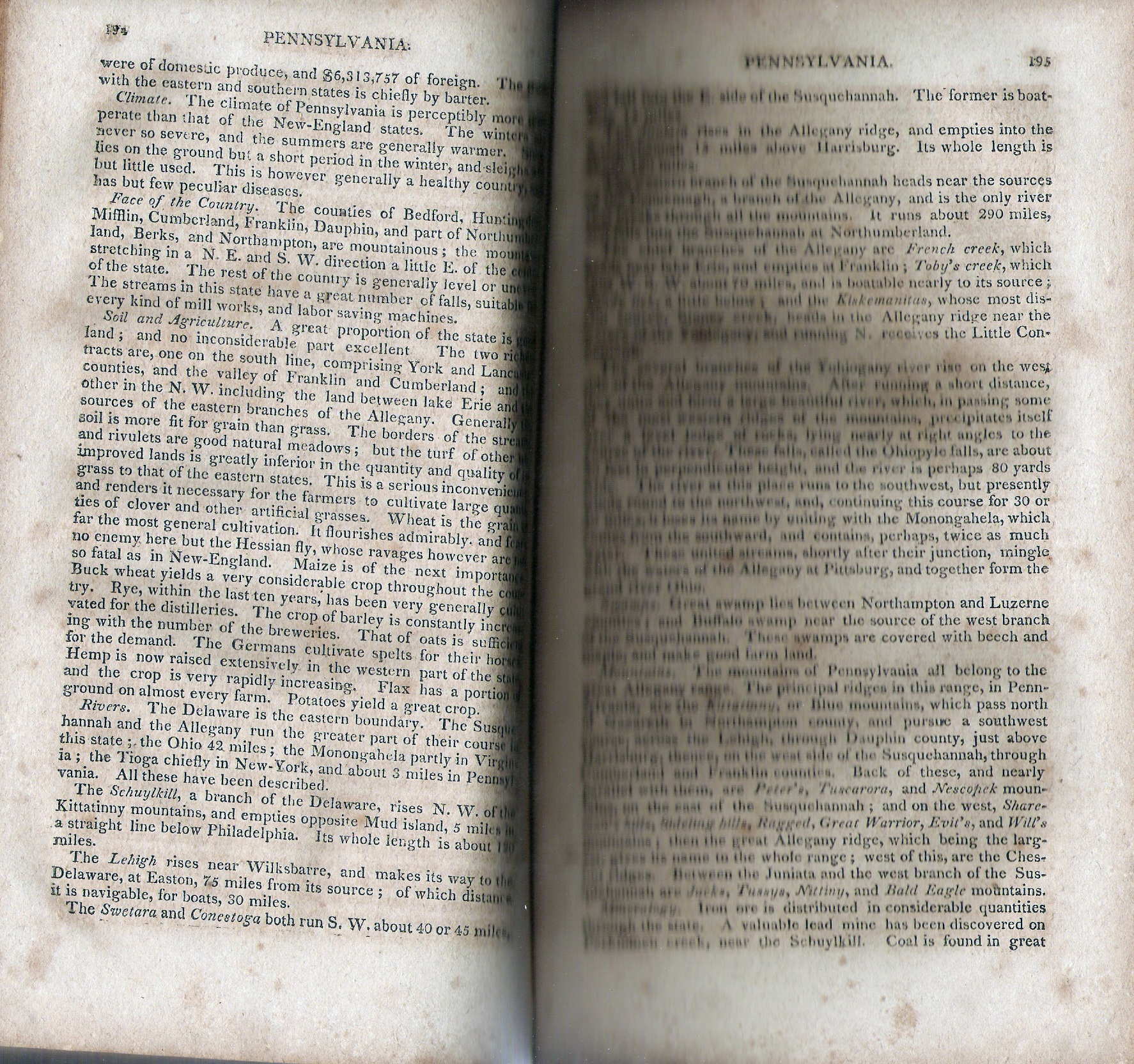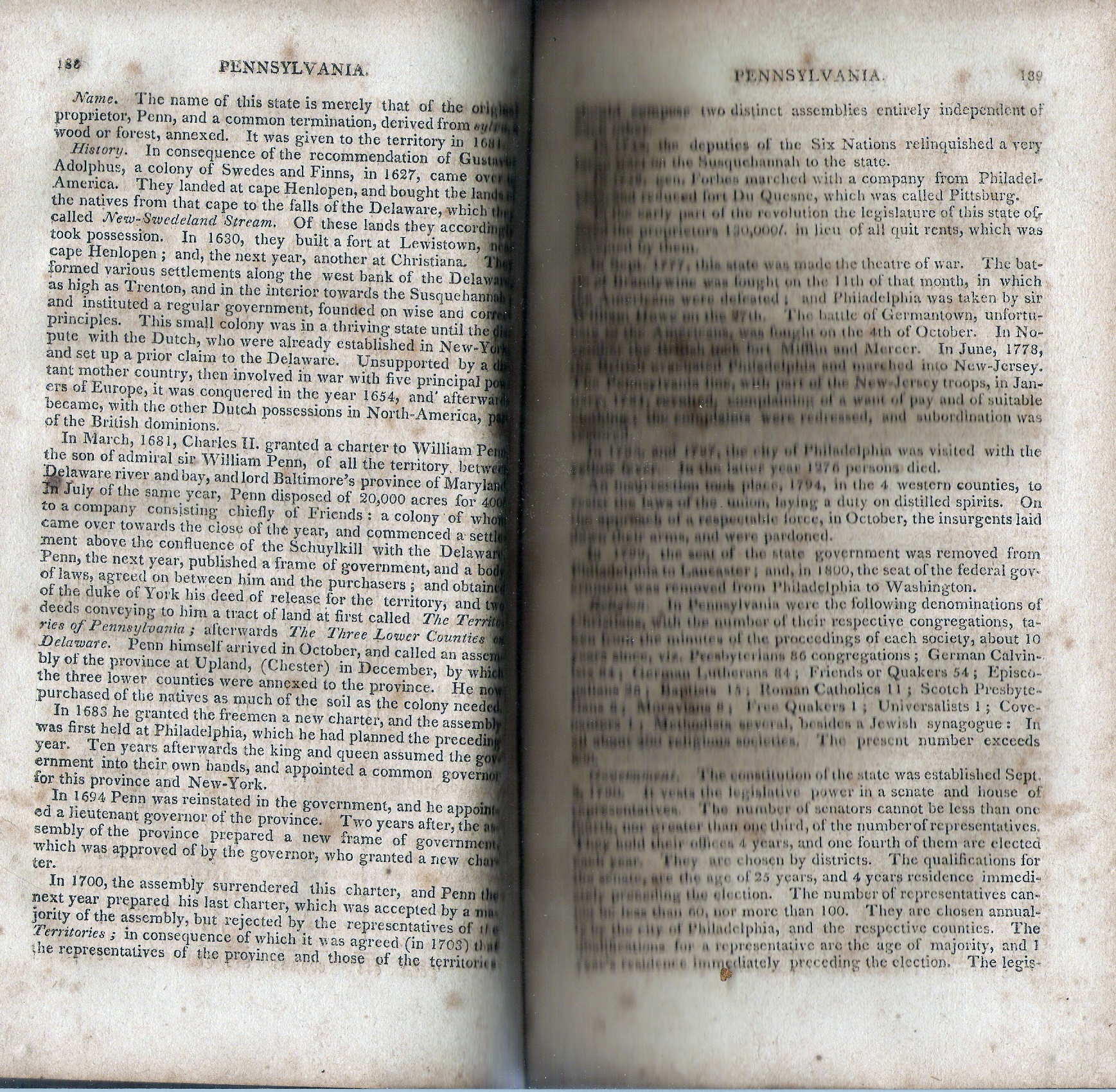 1808 A New and Easy System of Geography and Popular Astronomy; or an Introduction to Universal Geography... . By John O'Neill. Baltimore: Printed for the Publisher, by C. Dobein and Murphy, 10 Baltimore Street. 1808. The spine title is ‘O'Neill's Geography.’ This is a 500 page textbook with no maps, but there is a sketch in the astronomy section in the back. Pennsylvania is covered on pages: 104-105 , 106-107, 108-109, 110. The entire text, including the astronomy section, is in the form of questions and answers as illustrated by the Pennsylvania pages. This appears to have been the first edition of this book, there were later editions up to about 1820. Although this copy has no maps, some copies apparently had a fold-in world map as a frontispiece. Printed in letterpress relief. Size: 7.5 x 4.5 inches. |