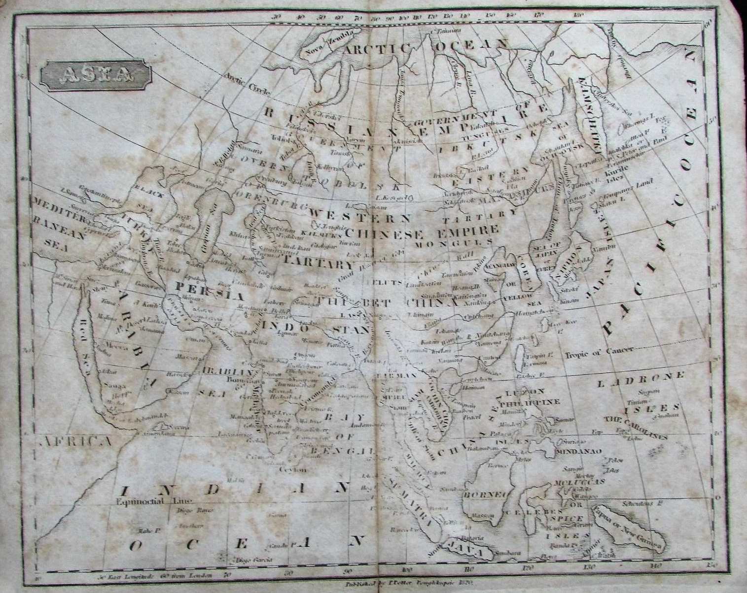 (1822) Atlas to Morse's Geography. This is a school atlas with marbled paper covers and containing eight maps by N. & S.S. Jocelyn, sc. (North America, South America, British Islands) and Annin & Smith, sc. Boston (United States, Asia). The World, Europe, and Africa maps are anonymous. The World and United States maps are double page. An atlas similar to this (except for the order of maps) was seen elsewhere which bears the same title but has the imprint 'Boston: Published by Richardson & Lord.' So, that is probably the publisher of this atlas. It is undated but Missouri (1821) appears as a state on the United States map, so it probably dates circa 1822. The eight maps are a subset of the maps contained in the twenty map 1822 Morse atlas described above: A New Universal Atlas of the World. The differences are in the World map which is only a single page map here; and in the amount of detail shown on three other maps though they are printed from an otherwise identical plate. The maps are intaglio prints, with blank verso. Size: 11.5 x 9.5 inches. |