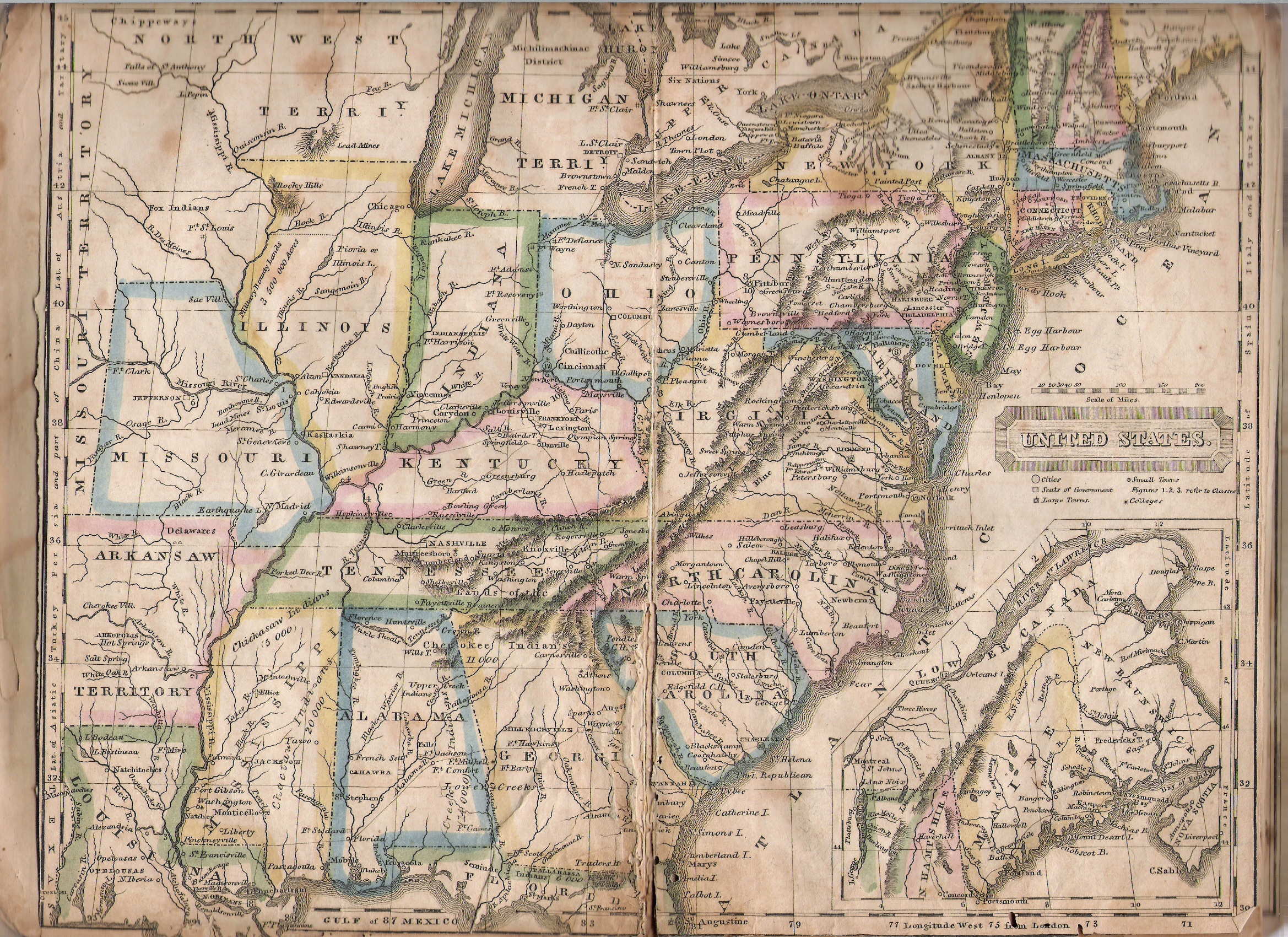 A MAP OF THE UNITED STATES AND PART OF LOUISIANA. Eng. by Wm. Kneass. This engraved map may originally have been bound but is now a loose inset in this copy of Scott's book. It shows the country to well beyond the Mississippi with the west blank except for rivers. In the east state boundaries are shown with dots and a few towns are named. Blank verso. Scale: 1 inch = 200 miles. Size: 8.5 x 10.5 inches. . |