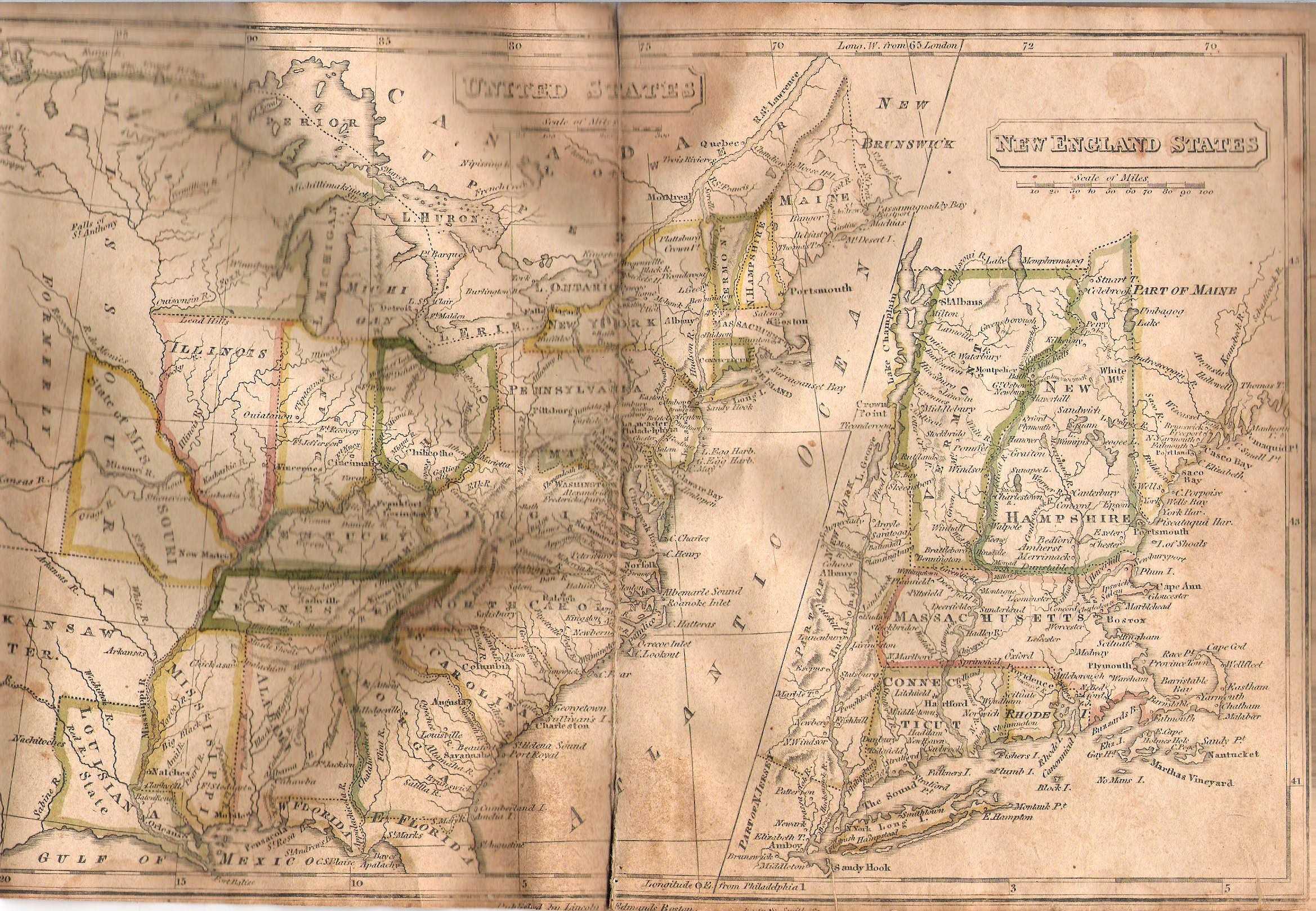 UNITED STATES. This map is from the above Woodbridge atlas and shows the eastern United States to just beyond the Mississippi. Missouri and Louisiana are states, Arkansas is still a territory. There is an inset of Maine at lower right. No maker or engraver is identified, the map appears to be a copper plate engraving. Longitude from Washington, blank verso. Scale: 1 inch = 160 miles. Size: 8.5 x 11 inches. |