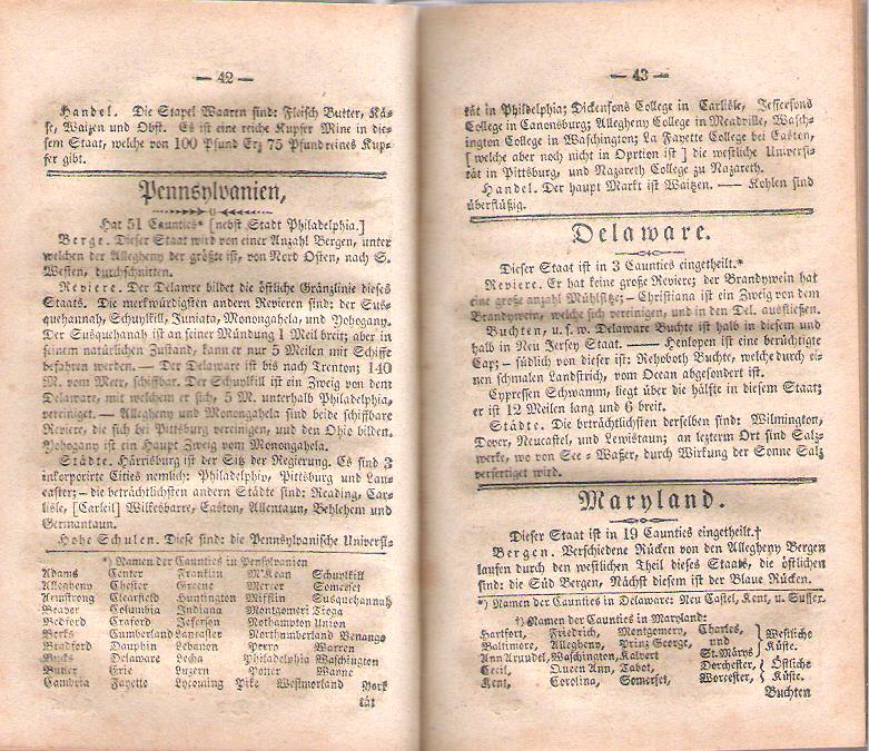 1835 Allgemeine Beschreibung der Welt oder Kurzgefaßte Darstellung des Wissenswürdigsten aus der Sternkunde, Naturgeschichte und Erdbeschreibung Bearbeitet nach den Neuesten und Besten quellen; für die Deutschen Bewohner Amerika's. (General Description of the World or Short Representation of Astronomy, Nature Story and Earth Description after the newest and best sources; for the German Inhabitants of America.) By E. Ludwig Walz, and given by Heinrich Diezel II Co., Lebanon County Pa. Philadelphia: Published by J.G. Wesselhoeft, 1835. The spine title is Geographie. This is a German language textbook of 428 pages with a few wood engravings in the text and one map. Wesselhoeft appears to have established German/English bookstores in New York, Philadelphia, and Baltimore. Pennsylvania had large German immigration from the late 17th to the mid 18th century, and a significant German language press developed around Germantown and Lancaster. This is a textbook intended for both school and general use. It starts with a geography discussion followed by description of each of the states, followed by countries. The Pennsylvania coverage is much more extensive over pages 163-228; only the first few pages are shown here: 163 , 164-165. A description of the individual counties begins on pages 180-181 and extends to page 228. Printed in German gothic letterpress relief with wood engraving illustrations. Size: 7 x 4.75 inches. |