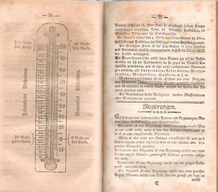 One of the few illustrations in the book is of a thermometer shown at left. It explains the difference between the Fahrenheit and Celsius scales. Wood engraving set with letterpress type. Size: 7 x 4.25 inches. |