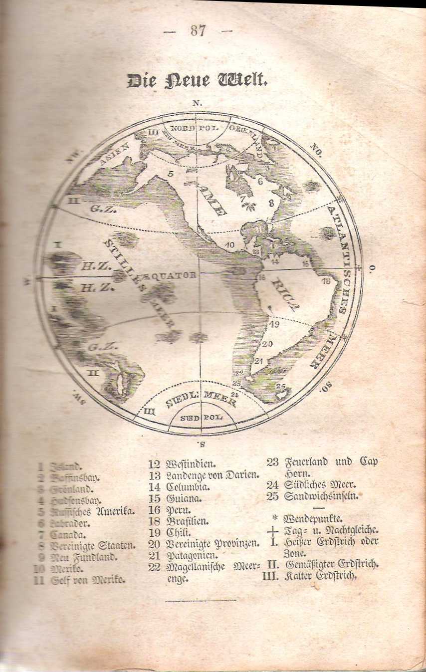 DIE NEUE WELT. This map of the western hemisphere appears on page 87 and is the only map in the book. The numbers refer to geographic forms as described in the text at the bottom. Wood engraving set with letterpress type. Size: 4 x 4 inches (map). |