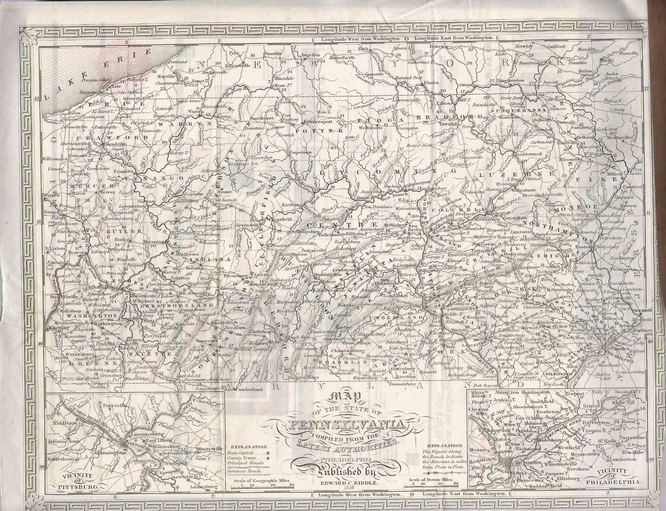 MAP OF THE STATE OF PENNSYLVANIA compiled from the latest authorities. Philadelphia. Published by Edward C. Biddle. 1843. This engraved map is attached to a page at the front of the Trego book and is similar to the one in the Eaton book above but later and garishly hand colored. There are insets of Pittsburgh and Philadelphia at the bottom. Longitude from Washington, blank verso. Scale: 1 inch = 50 miles. Size: 8 x 10 inches. |