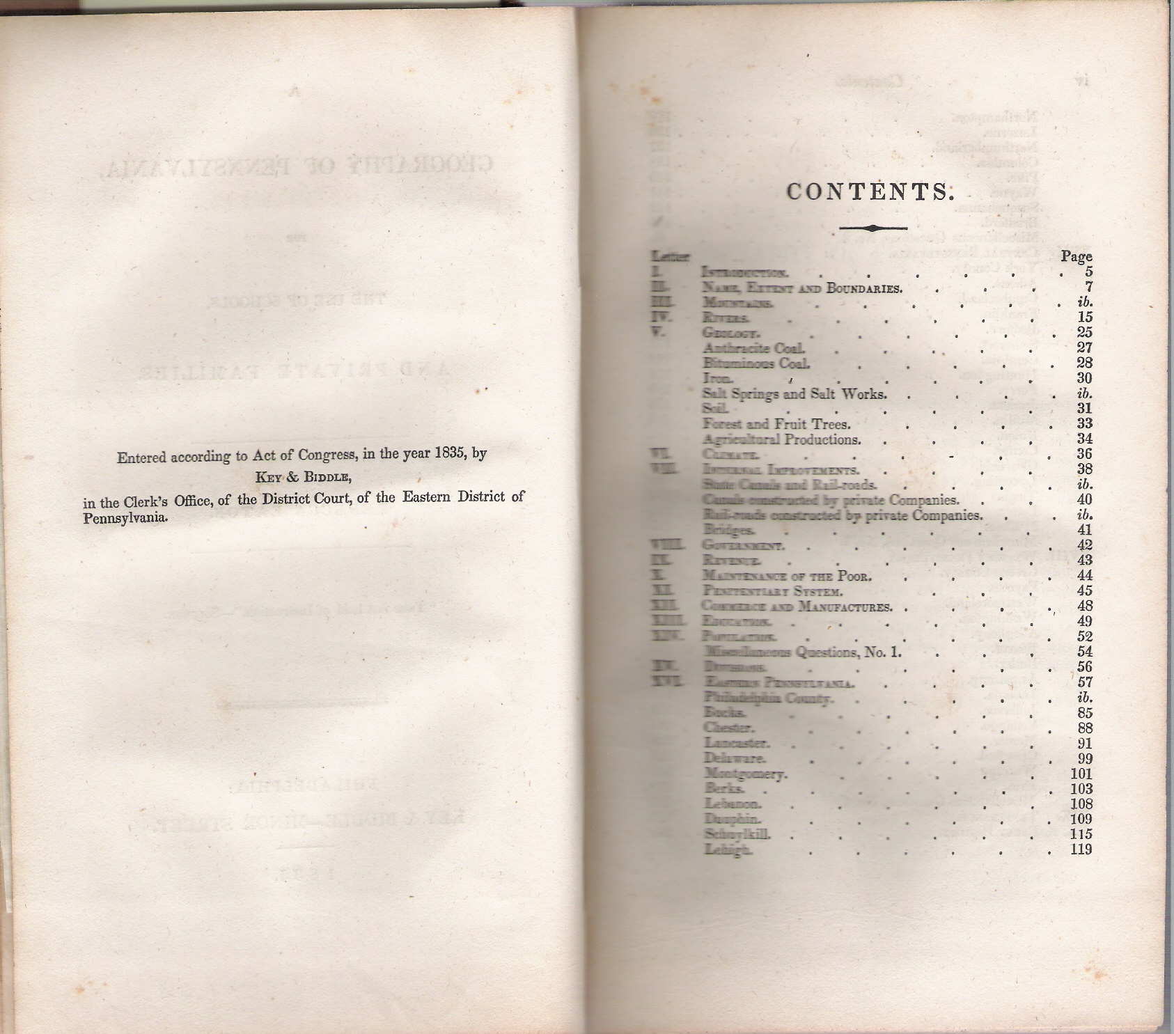 1837 Elementary Exercises in Geography for the Use of Schools, By Samuel H. Gummere, Sixth Edition, Corrected and Improved. Kimber & Sharpless, No. 8 South Fourth St. Philadelphia. This small 180 page textbook has no maps or illustrations; and is intended for small children. The Pennsylvania description is on the following pages: 32-33, 34-35. Printed in letterpress relief. Size: 6 x 3.75 inches. |