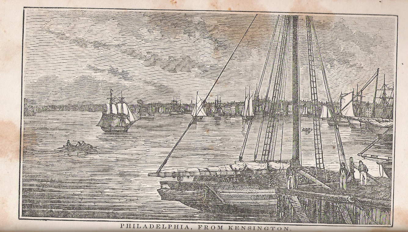 PHILADELPHIA. Drawn by J. R. Smith. Engraved by J. B. Neagle. This distant view of the Philadelphia waterfront from the Delaware River appears opposite page 220 in Volume 2 of the Malte-Brun geography, and all three volumes are filled with various views like this. There are views of Boston, New York, and Baltimore, for example. Printed from an engraving and then bound with the text. View size: 5.5 x 8 inches. |