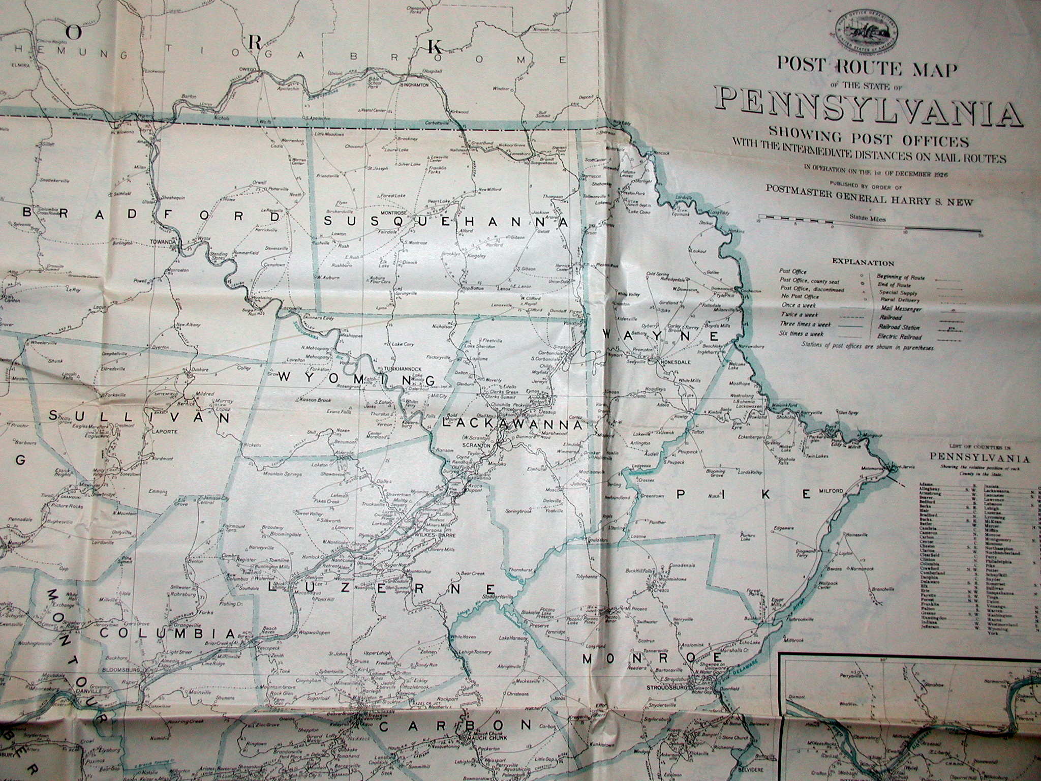 POST ROUTE MAP OF THE STATE OF PENNSYLVANIA SHOWING POST