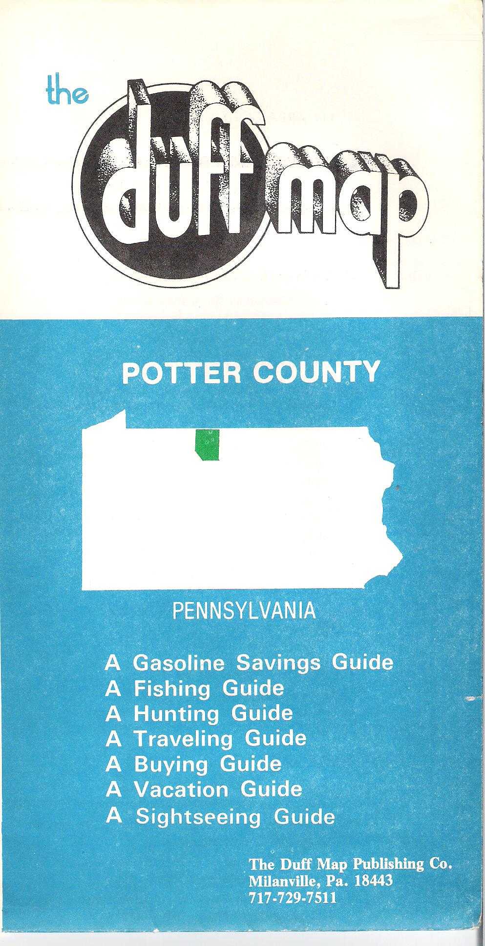 |  | 1980 THE DUFF MAP POTTER COUNTY. The Duff Map Publishing Co., Milanville, Pa. This undated map has a reference to 1979 in the text, so is dated circa 1980. It is basically a road map with text on the verso listing businesses. These 'Duff maps' were made for several counties along the Pennsylvania - New York border. Size: 19 x 25 inches. |