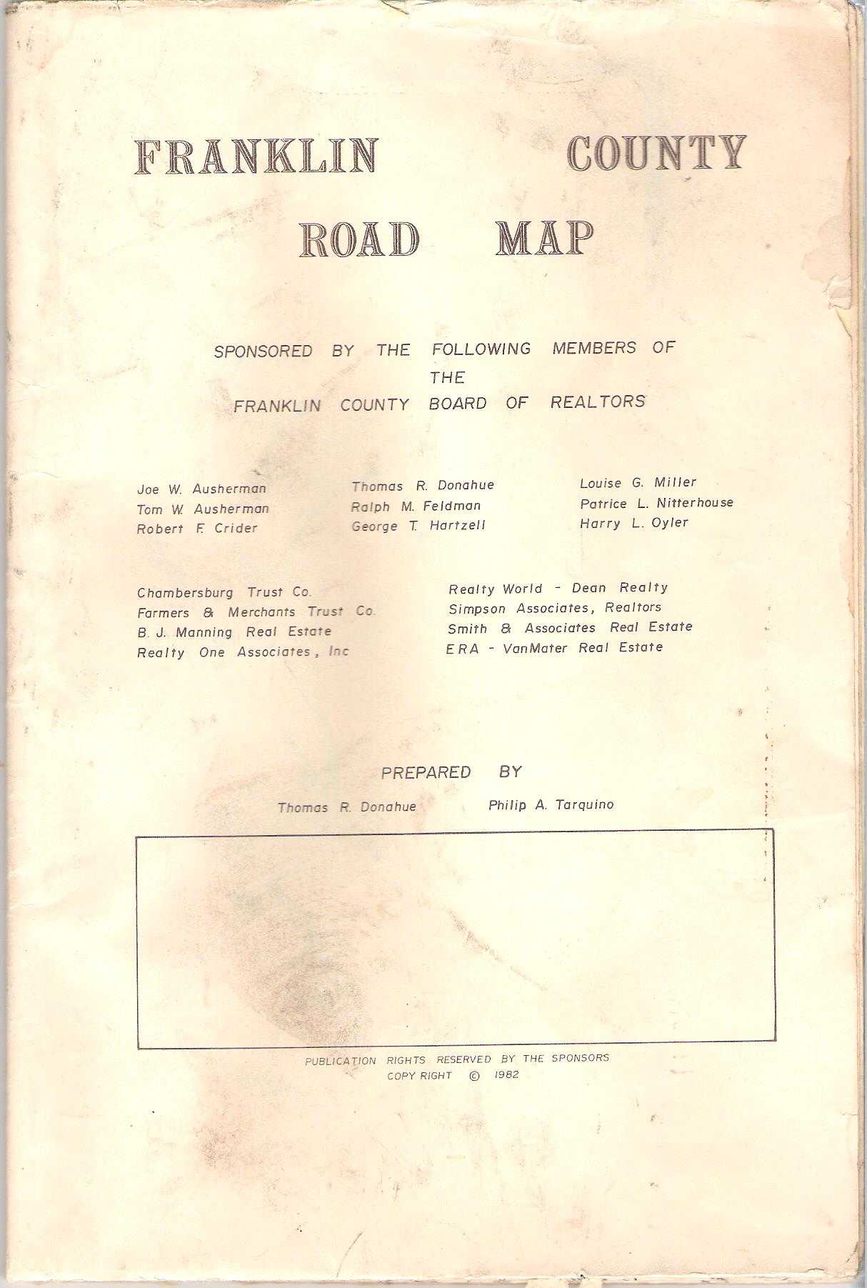 |  | 1982 FRANKLIN COUNTY ROAD MAP. Prepared by Thomas R. Donahue, Philip A. Tarquino. Sponsored by Franklin County Board of Realtors. For obvious reasons, realtors like to give out maps. This is a street map of Chambersburg on one side, with a street gazetteer, smaller maps of other boroughs, and a county map on the verso. Size: 24 x 36 inches. |