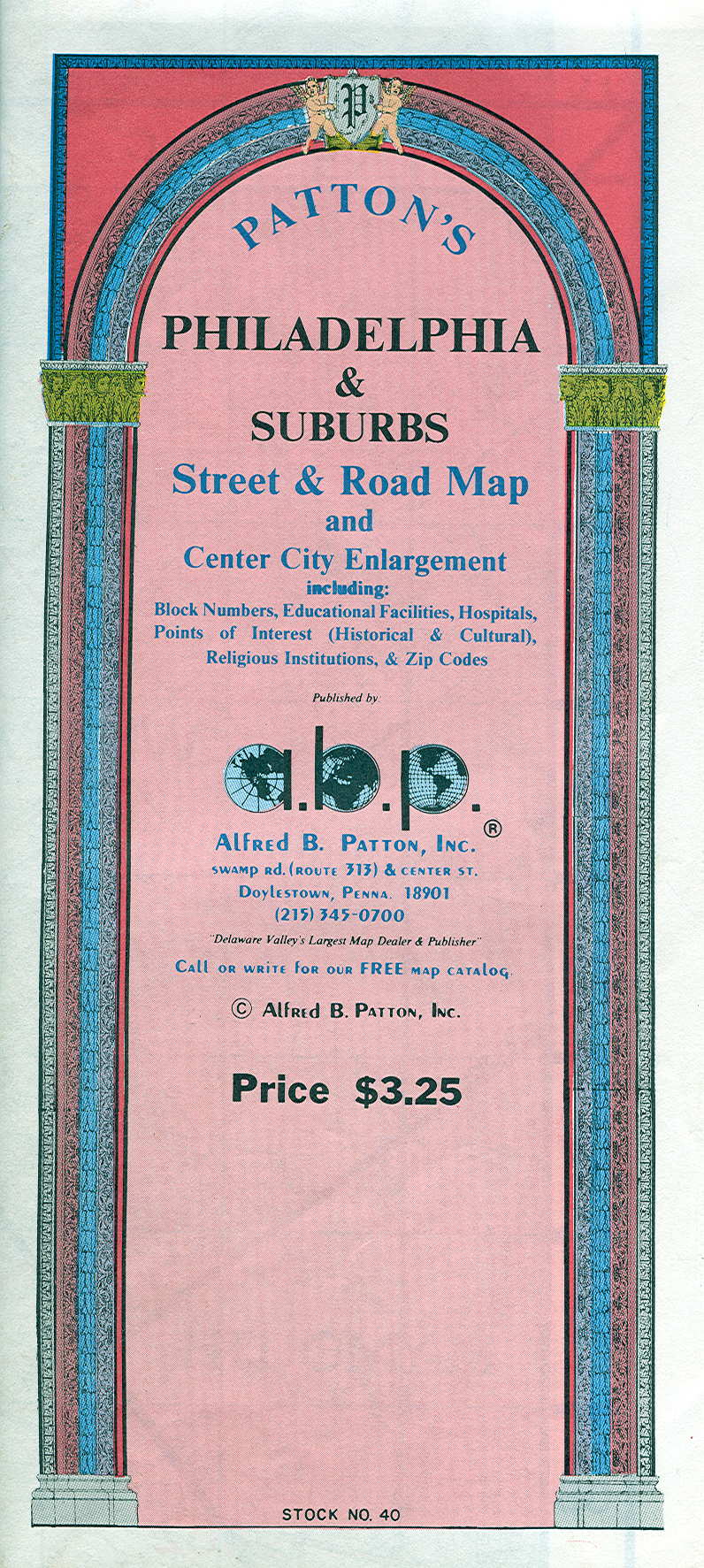 |  | 1989 PATTON'S PHILADELPHIA & SUBURBS STREET & ROAD MAP AND CENTER CITY ENLARGEMENT, by Alfred B. Patton Inc., Doylestown, Penna. This is a large (45 x 35 inches) and detailed road map of the entire Philadelphia area on one side and a street gazetteer on the other. There is also a large scale center city layout with individual buildings identified; an excellent map for Philadelphia area drivers and tourists. |