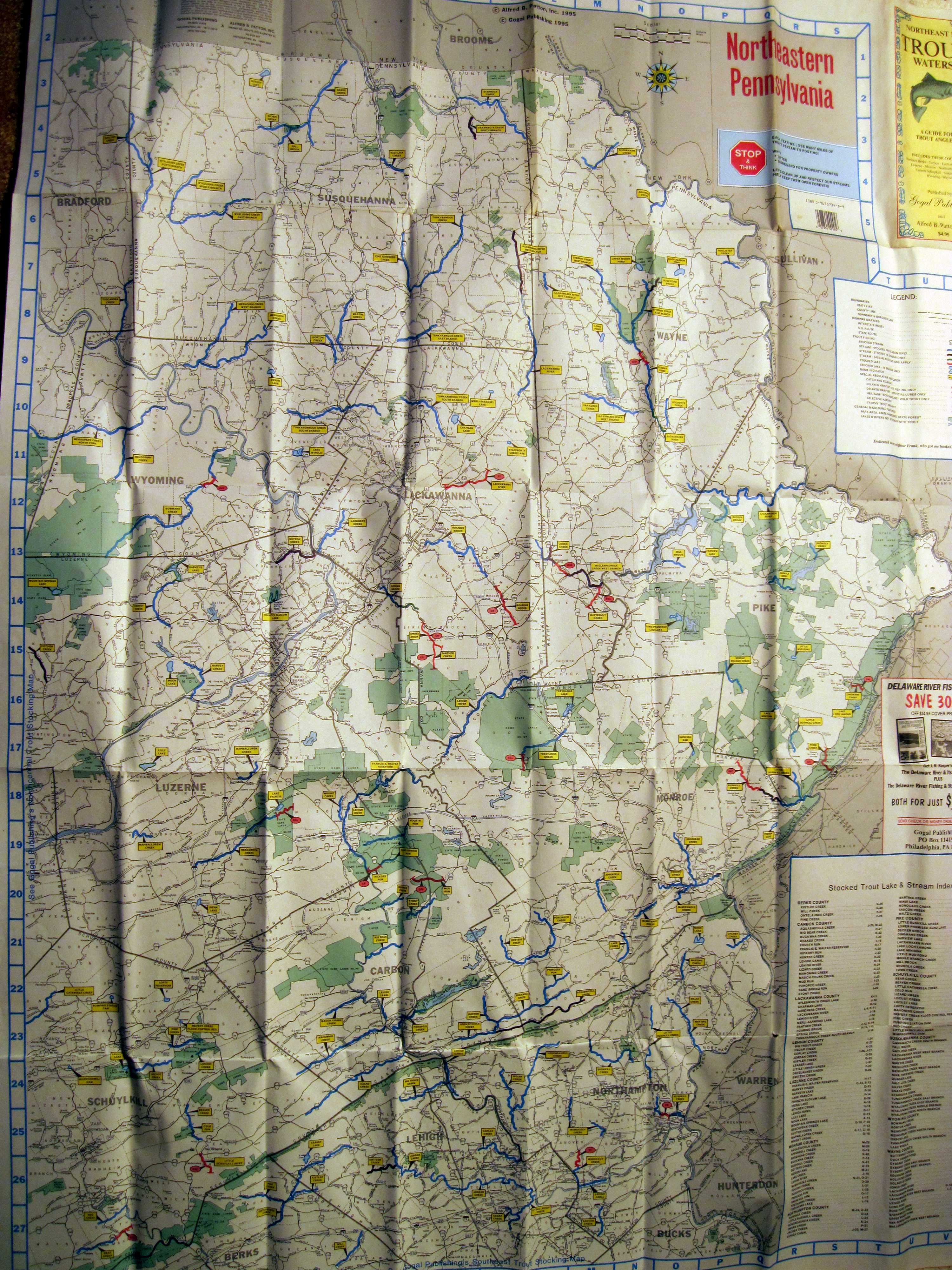 NORTHEAST PA TROUT WATERS, A GUIDE FOR ANGLERS. Published by Gogal Publishing and Alfred B. Patton, Inc. 1995. The map is titled 'Northeastern Pennsylvania'. This is an attractive road map with the stream locations overlaid in blue. Similar maps were made for other parts of the state. Blank verso. Size: 45 x 35 inches. |