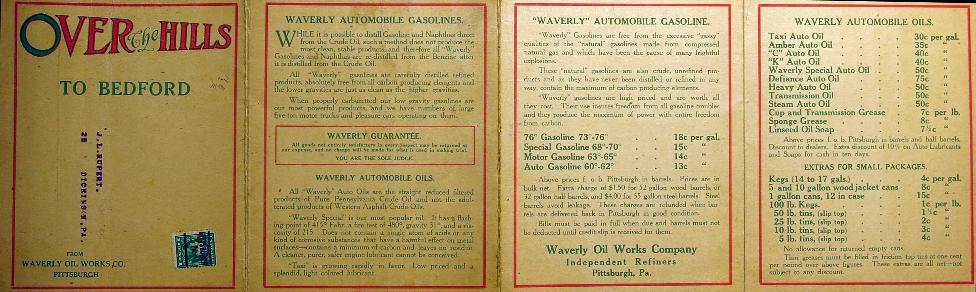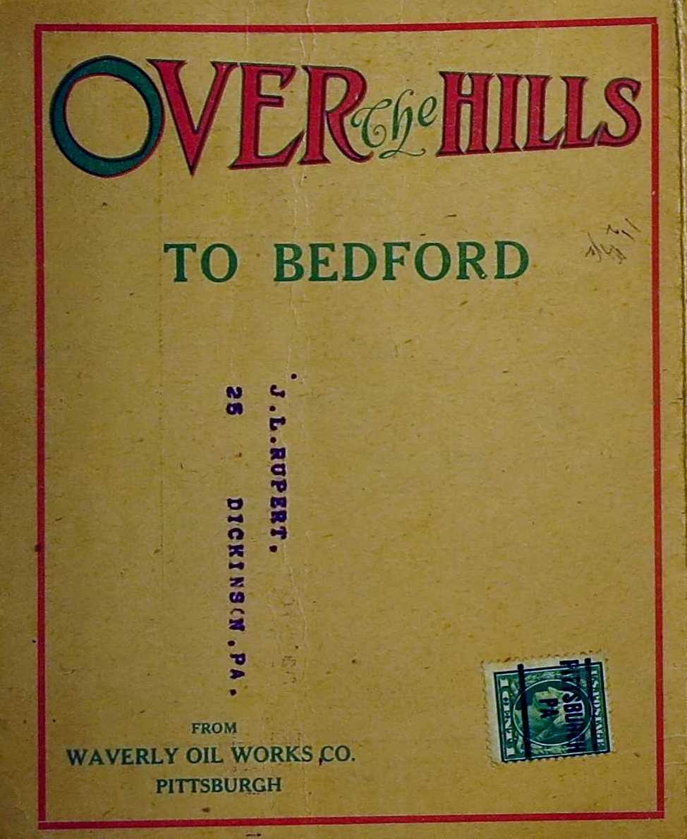 WAVERLY OIL WORKS. 'Over the Hills to Bedford' is the title on this undated map from an early Pittsburgh oil refiner. Waverly published a map in 1916 of New York and western Pennsylvania, so that date is used here. The 1 cent postage stamp on the cover dates 1908-1922, so the map was issued sometime in that period. The unusual