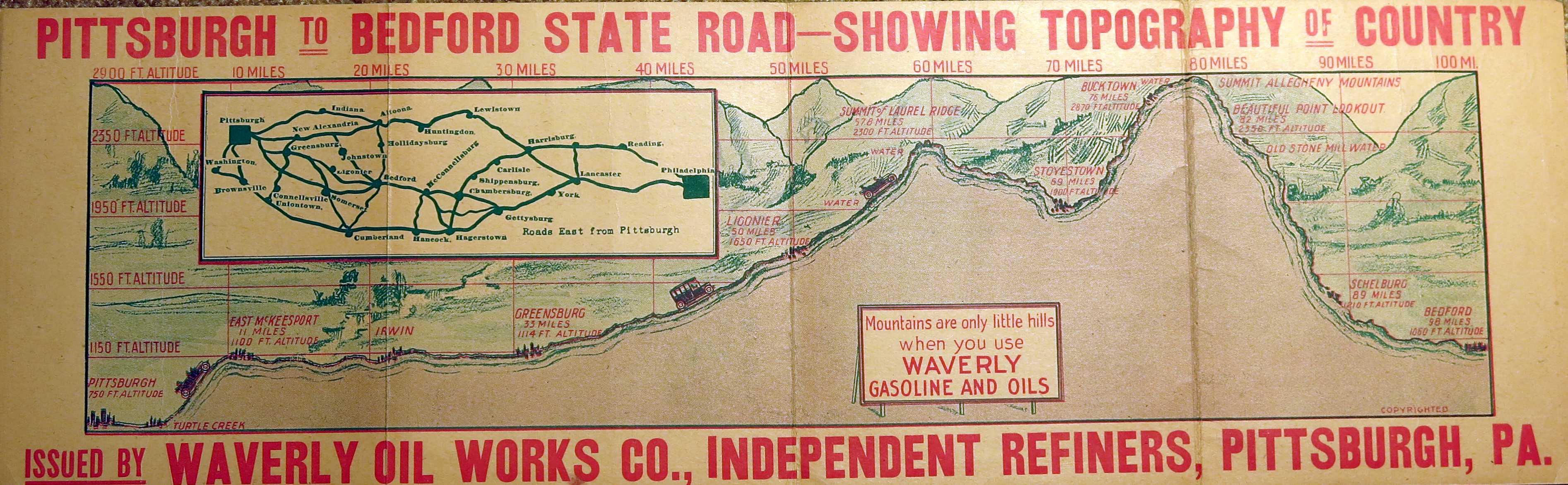 map shows the elevation profile between Pittsburgh and Bedford. A watering stop, important for early radiators, is shown at the top of the Allegheny summit. The