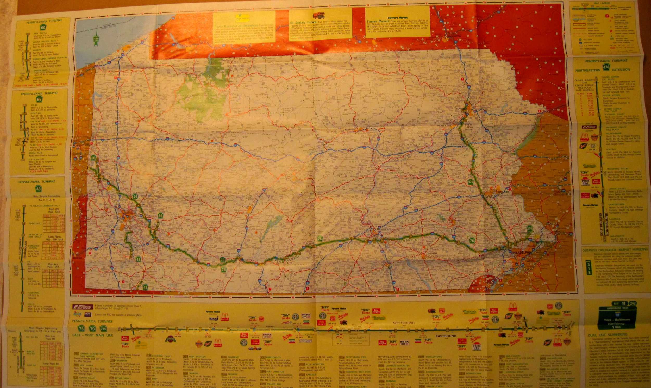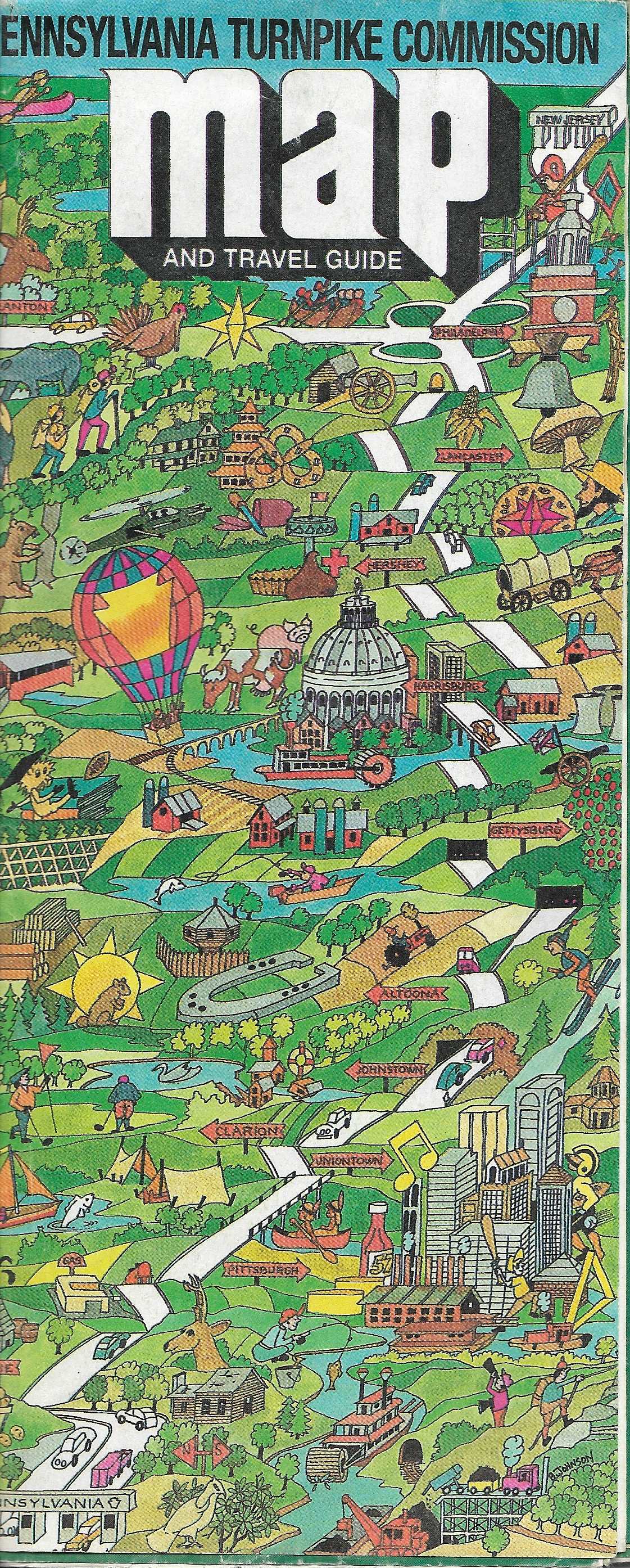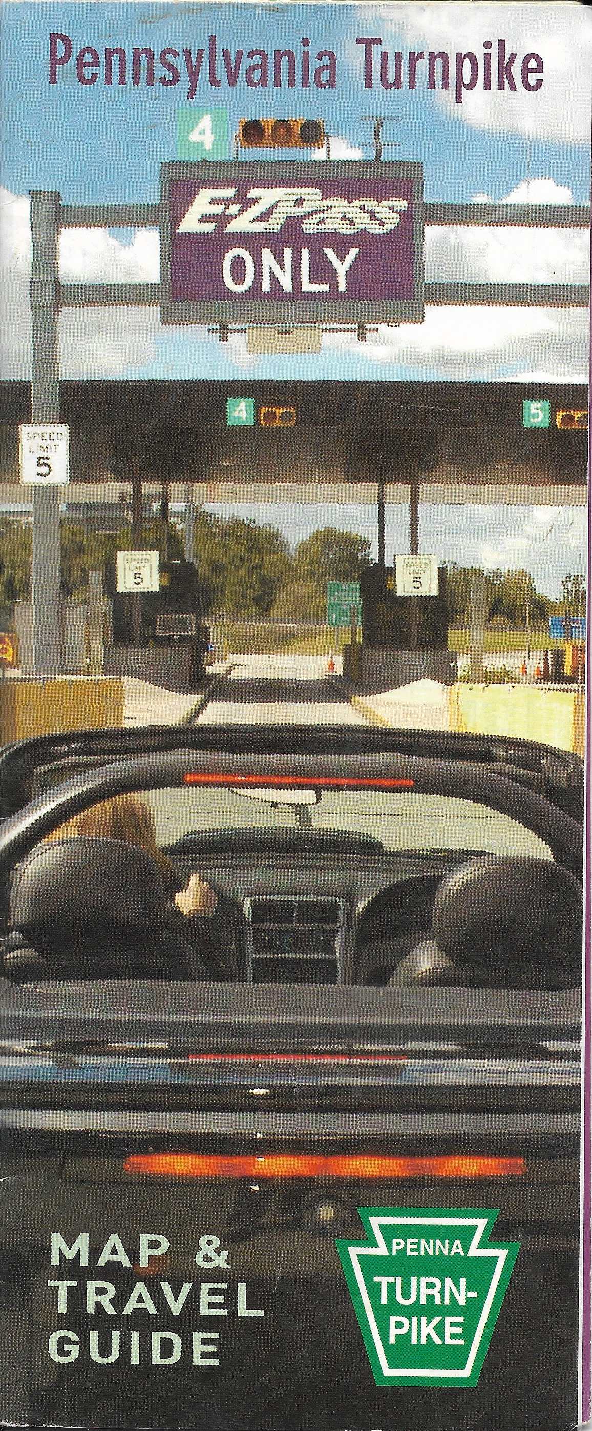 Pennsylvania Turnpike Commission Map and Travel Guide, Computer generated by Department of Transportation Geographic Information Division, Pennsylvania Turnpike Commission. This map is surrounded by a figurative strip map of the turnpike as shown here. This format began with the 2000 map above. City maps on the verso. |