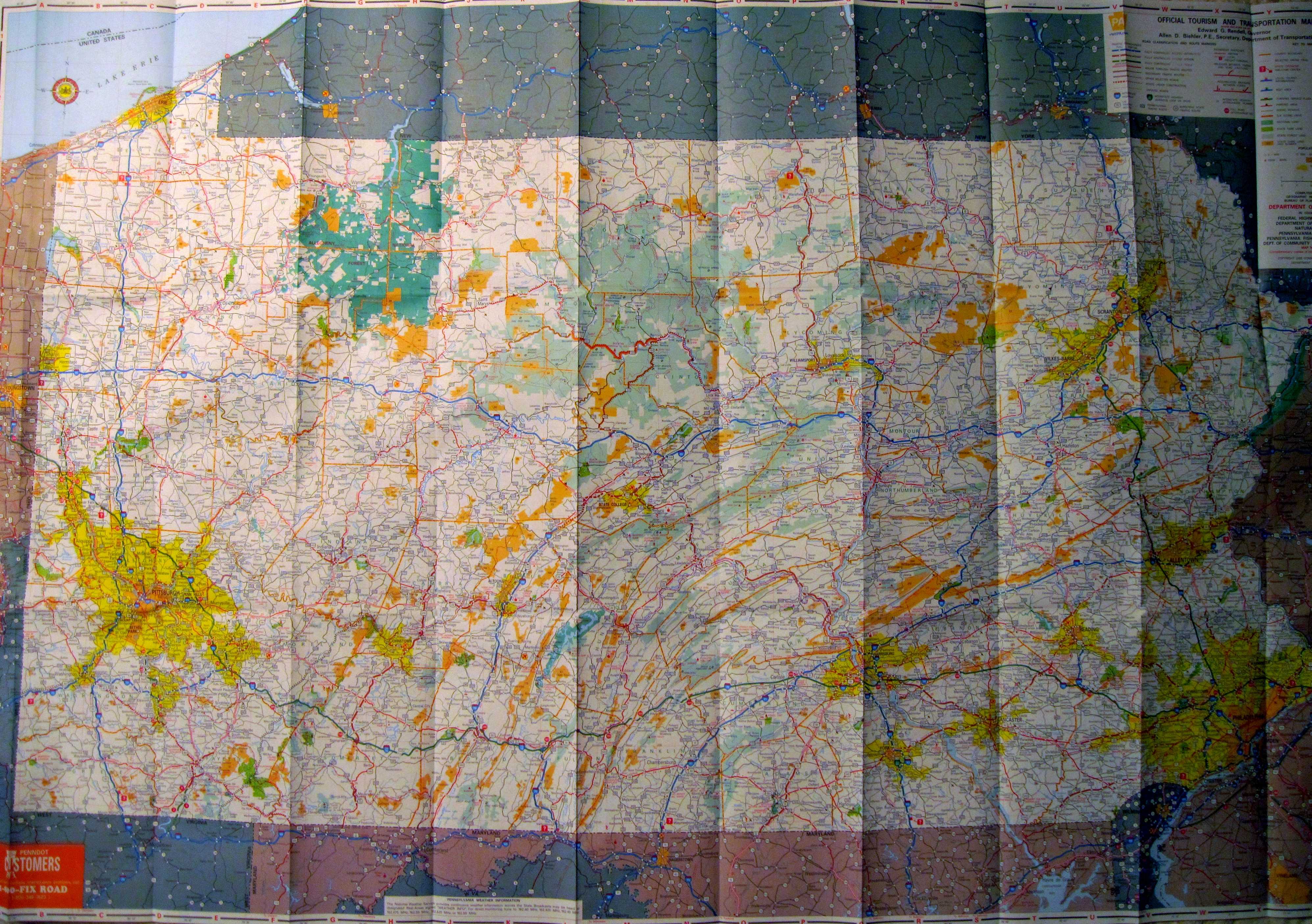 There are several tourist attractions featured on the cover of this 27 x 44 inch map. The elk is part of a ~500 or so herd that roams (yes) Elk County and parts of the surrounding counties. Elk became extinct in Pennsylvania in the late 1800s or early 1900s and this herd was started with a small group brought from the Rocky Mountains. |